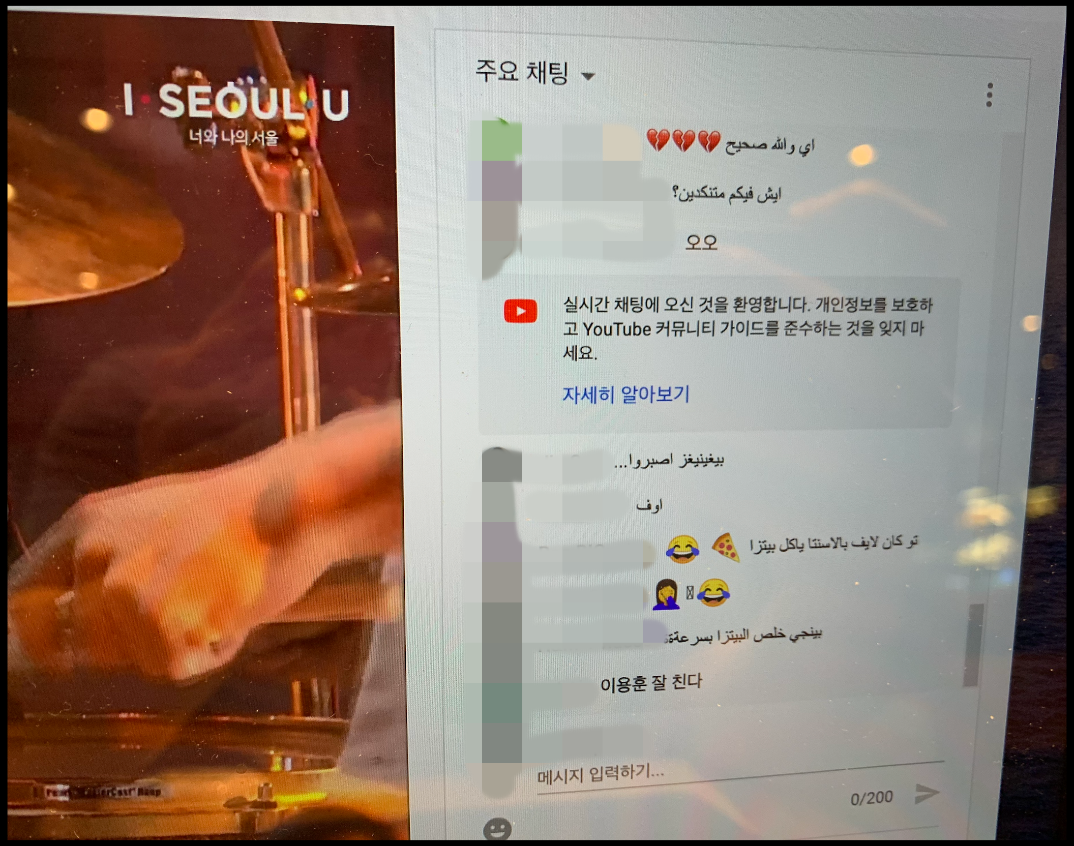 다만, 공연을 시청하면서 채팅창을 봤는데 아랍어가 많은 이유는 저도 잘 모르겠습니다. 혹시 해외 드러머 현지 공연과 연관되지 않았나 싶은 생각을 해봤는데 그 분들은 미국, 벨기에, 오스트리아에 거주하기 때문에 아랍어권에 속해있지 않습니다. 아랍에서 서울드럼페스티벌이 유명한가에 대해서는 잘 모르겠으나 해외에서 이 공연을 시청하는 누리꾼들이 있다는 것은 의외였습니다. 기존의 오프라인에서 펼쳐졌던 서울드럼페스티벌이라면 서울 시민들이 지켜보는 공연이었을텐데 올해 온라인 생중계로 전환되자 한국 뿐만 아니라 세계에서도 시청하는 콘텐츠가 되었습니다. 이런 현상이 온라인 공연의 묘미가 아닐까 싶습니다. 해외도 코로나19 확산이 극심하기 때문에 온라인 공연에 대한 수요가 존재할 겁니다.