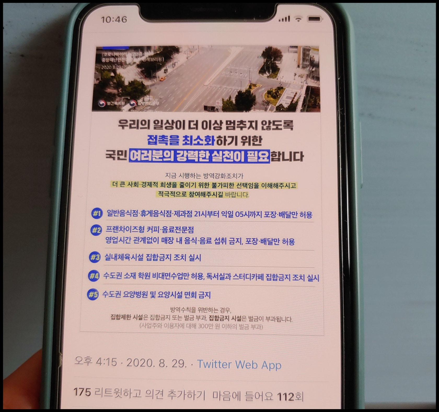 [사진 = 보건복지부는 지난 8월 29일 공식 트위터를 통해 사회적 거리두기 2단계 수도권 방역강화 추가 조치에 대한 언급을 했습니다. 만약 방역수칙 위반 시 집합제한 시설은 집합금지 또는 벌금부과, 집합금지 시설은 벌금 부과된다고 합니다. 사업주와 이용자에 대해 300만 원 이하의 벌금 부과됩니다. (C) 보건복지부 공식 트위터]