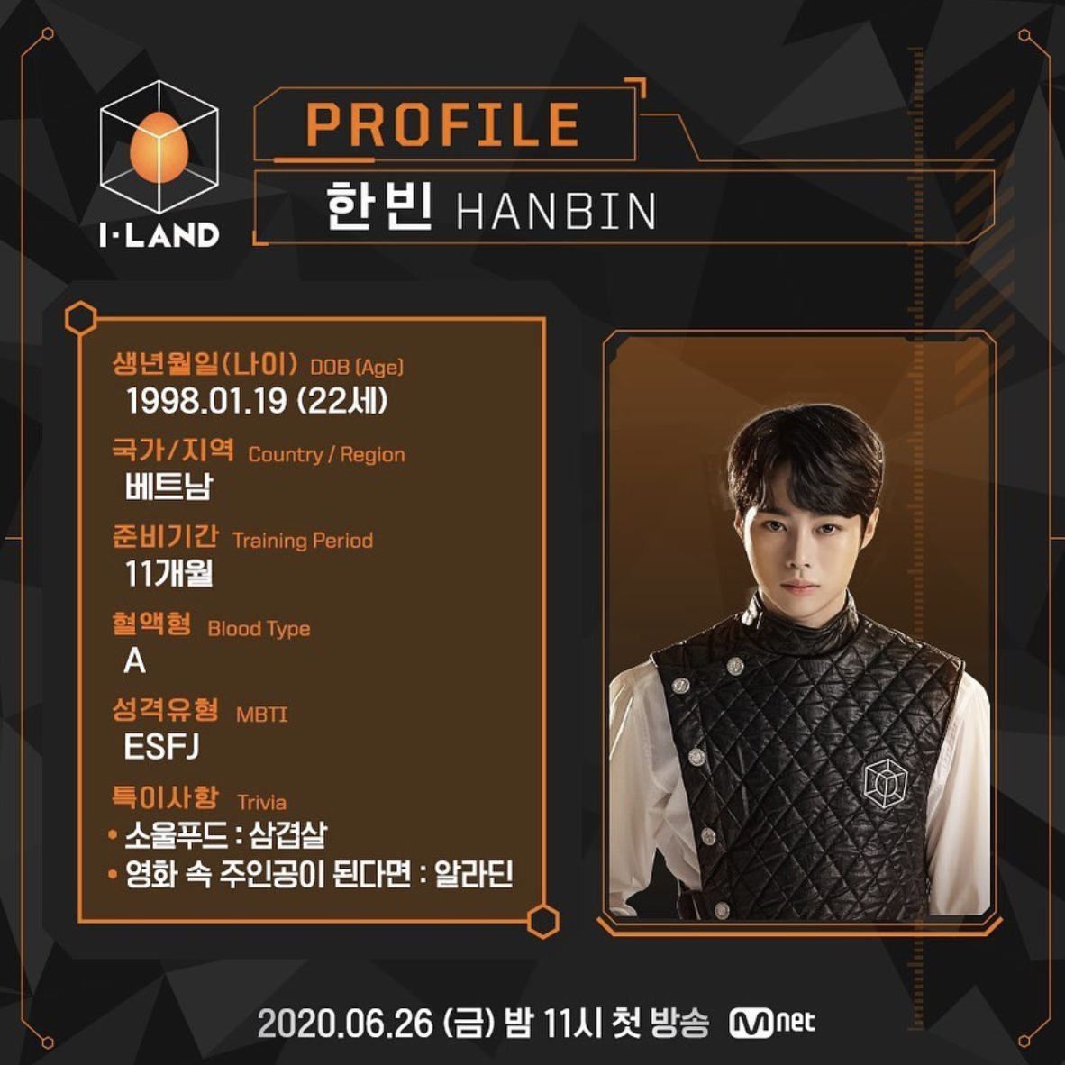 [사진 = 아이랜드 한빈 국적 베트남이며 나이 만 기준으로 22세(1998년 1월 19일생, 한국식 나이 23세) 입니다. 현재 잔류한 준비생들 중에는 케이에 이어 두 번째로 나이 많습니다. 아이랜드 케이 나이 만 기준으로 22세(1997년 10월 21일생, 한국식 나이 24세)이나 97년생입니다. (C) Mnet 아이랜드 공식 인스타그램]