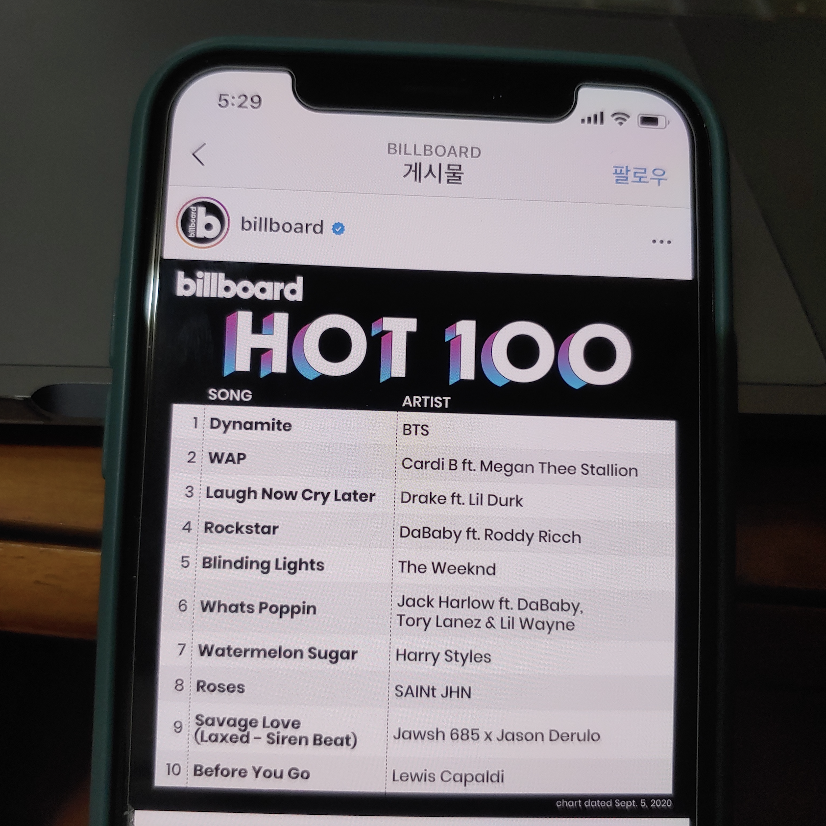 [사진 = 빌보드 공식 인스타그램에서는 9월 첫 주 방탄소년단 빌보드 핫100 1위를 알렸습니다. (C) 빌보드(billboard) 공식 인스타그램]