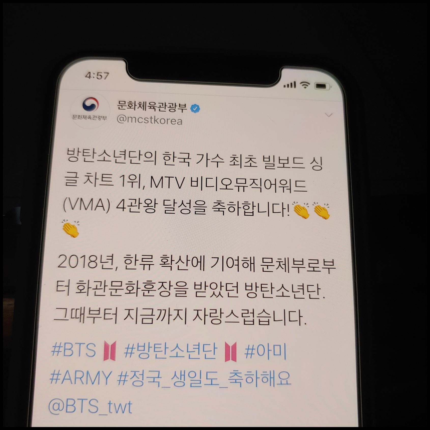 [사진 = 문화체육관광부 공식 트위터에서는 방탄소년단이 한국 가수 최초로 빌보드 싱글 차트(핫100) 1위, MTV 비디오 뮤직 어워드(VMA) 4관왕 달성 축하하는 게시물을 올렸습니다. 그러면서 방탄소년단이 2018년 문화체육관광부로부터 화관문화훈장 받았음을 알렸습니다. (C) 문화체육관광부 공식 트위터]