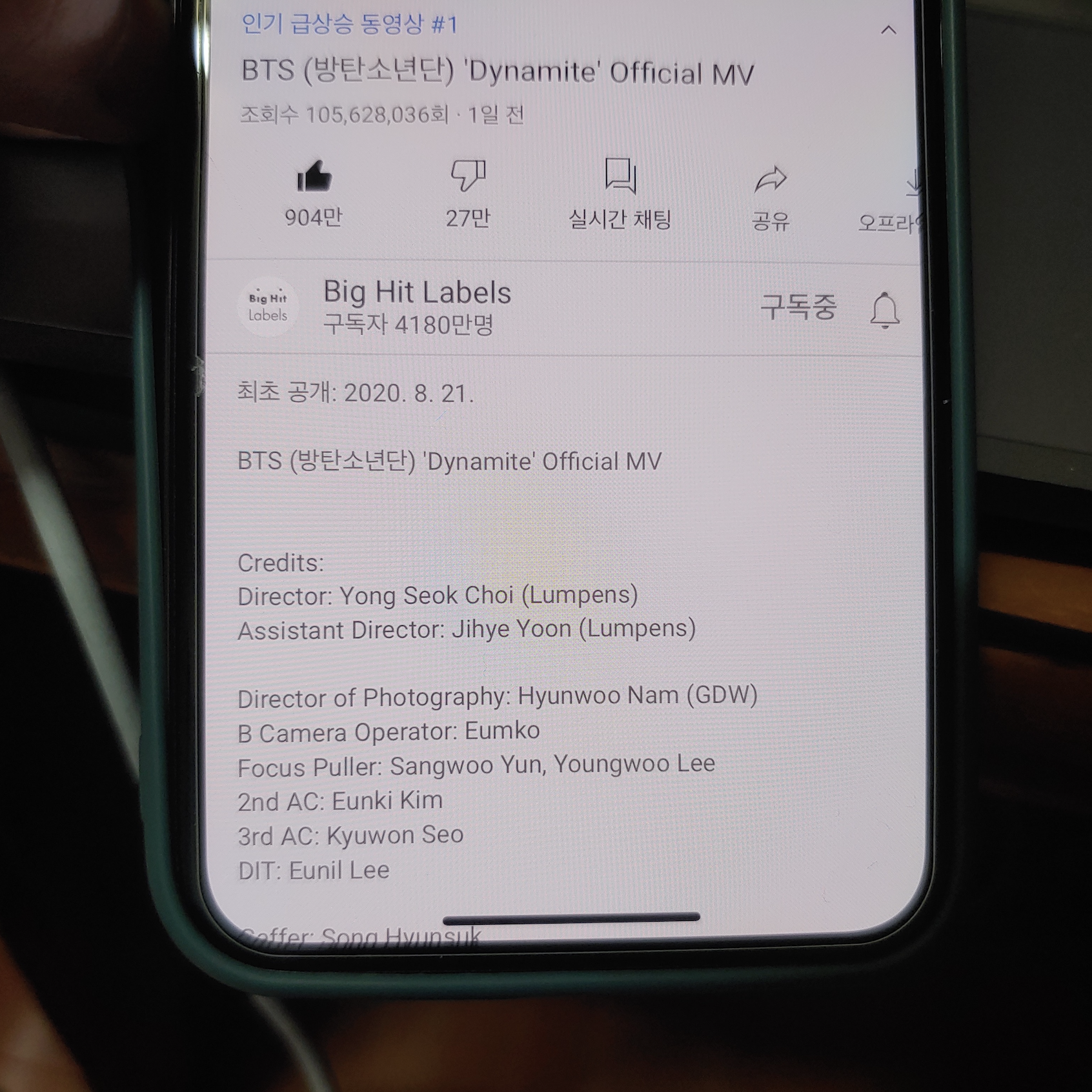 [사진 = 방탄소년단에게 핫100 1위를 안겨줬던 Dynamite 뮤직비디오는 유튜브에서 공개된지 하루 만에 조회 수 1억 뷰 넘을 정도로 엄청난 인기를 얻었습니다. (C) Big Hit Labels 유튜브 채널]