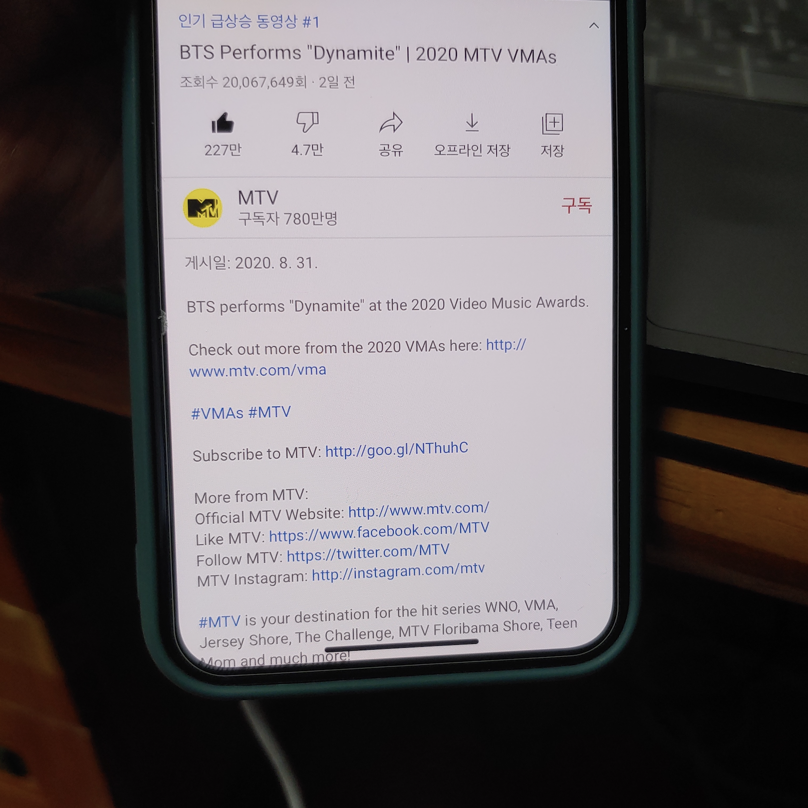 [사진 = 방탄소년단은 MTV 비디오 뮤직 어워드에서 4관왕 달성했으며 이날 Dynamite 무대를 선보였습니다. 그 영상의 조회 수가 유튜브에서 2천만 뷰 넘었으며 한국에서는 유튜브 인기 급상승 동영상 1위를 기록했습니다. (C) MTV 공식 유튜브 채널]