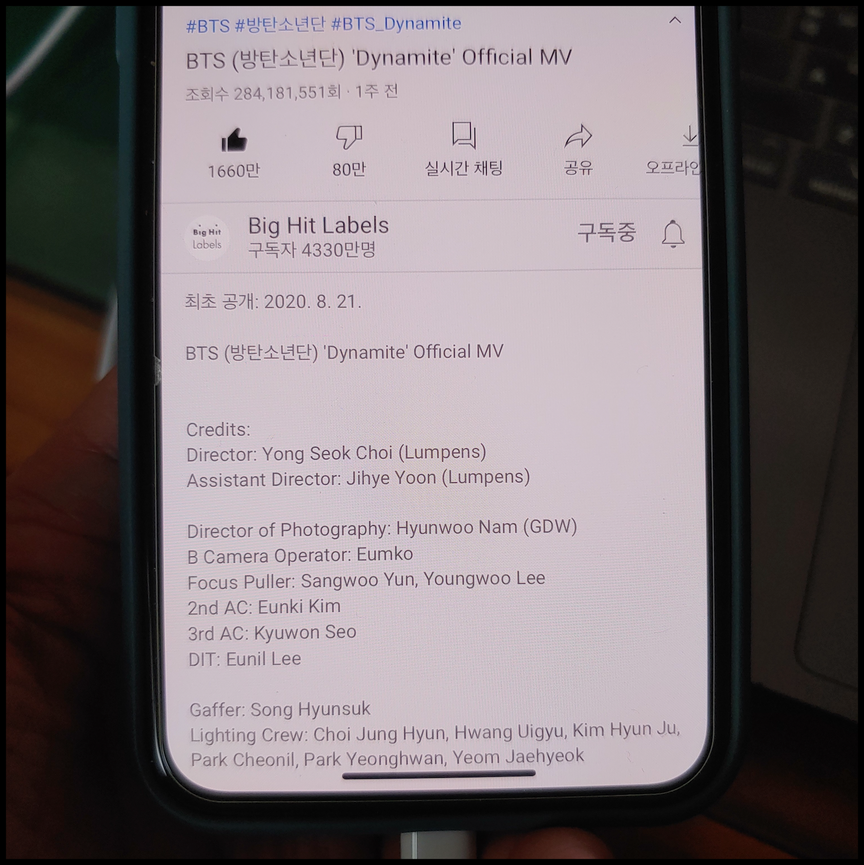 [사진 = 방탄소년단은 지난 8월 21일 Dynamite 뮤직비디오를 유튜브에서 공개했습니다. 9월 3일 현재 조회 수 2.8억 회 기록할 정도로 전 세계에서 많은 사람들이 방탄소년단 Dynamite 뮤직비디오 시청했습니다. 이 노래로 한국 가수 최초로 미국 빌보드 핫100 1위를 달성하며 미국 시장 정복에 성공했습니다. (C) Big Hit Labels 공식 유튜브 채널]