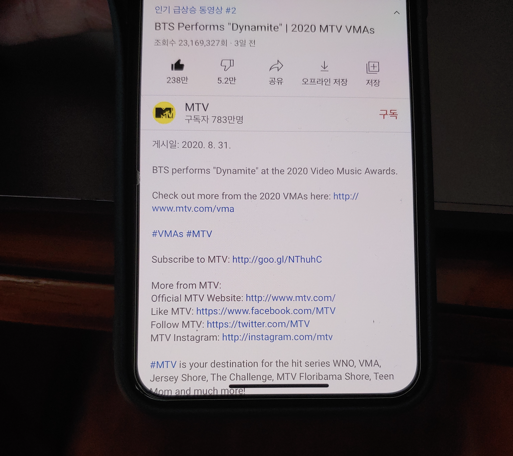 [사진 = 미국 MTV 비디오 뮤직 어워즈 공식 유튜브에서 공개했던 방탄소년단 Dynamite 라이브 영상이 업로드된지 3일 만에 조회 수 2,300만 회 돌파했습니다. 현재 한국 유튜브에서는 인기 급상승 동영상 2위 기록중입니다. (C) 미국 MTV 비디오 뮤직 어워즈 공식 유튜브]