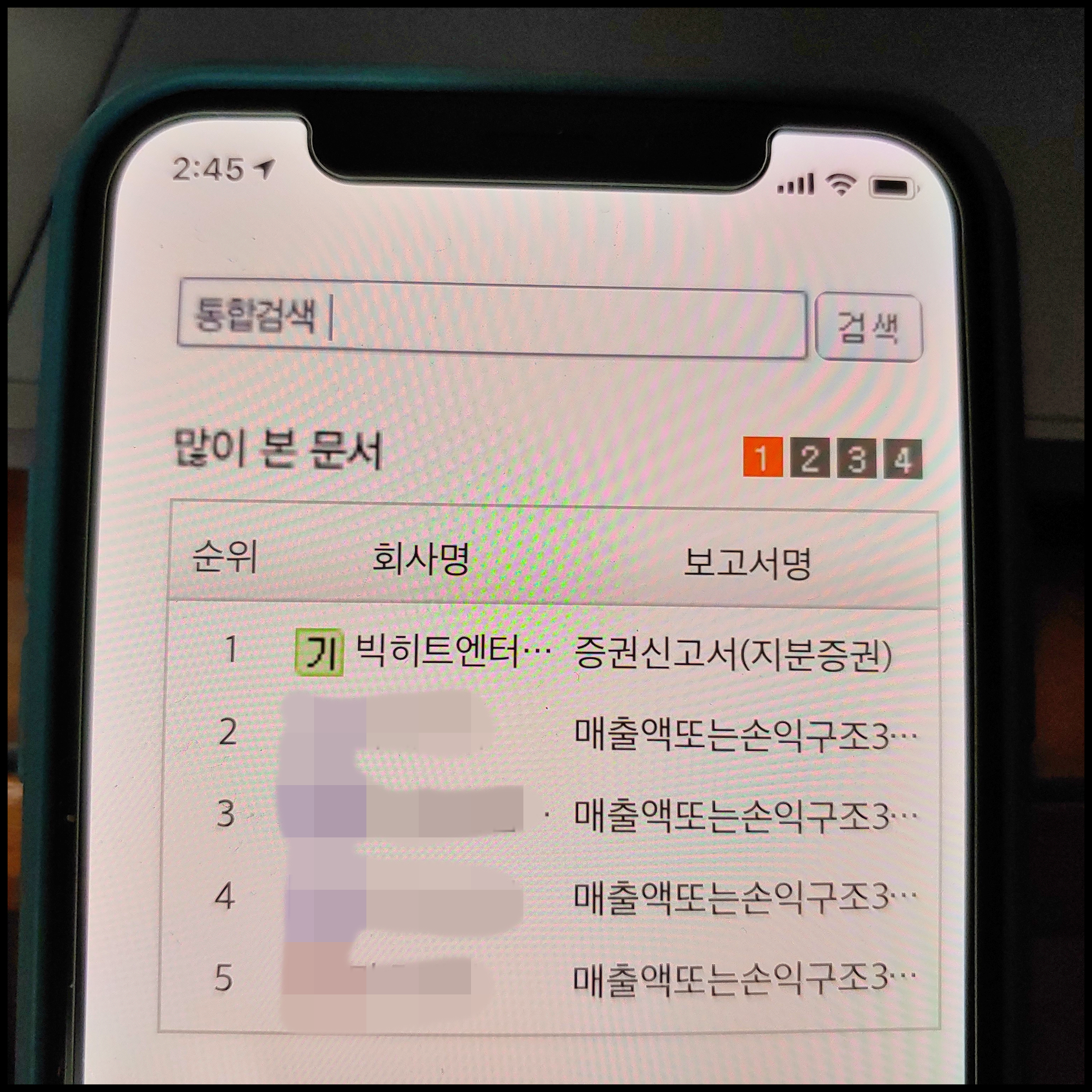 [사진 = 9월 3일 기준으로 금융감독원 전자공시시스템 공식 홈페이지에서 많이 본 문서 1위는 빅히트엔터테인먼트 증권신고서 입니다. 이번 상장을 통해서 713만 주 공모하며 공모 예정가는 105,000원~135,000원이라고 합니다. 빅히트엔터테인먼트 청약 기일은 오는 10월 5일부터 6일까지 이틀 동안이며 청약공고일 10월 5일, 배정공고일 10월 8일 언급이 있었습니다. 그와 더불어 방탄소년단 주식 증여 관련 부분이 있었습니다. 최대주주의 지분 1.68%를 아티스트에게 증여한다는 부분인데 여기서 최대주주는 방시혁 의장이며 아티스트는 방탄소년단입니다. 김석진(활동명 : 진) 포함한 7명의 방탄소년단 멤버들은 방시혁 의장으로부터 지분 1.68%를 받게 됐습니다. (C) 금융감독원 전자공시시스템 공식 홈페이지]