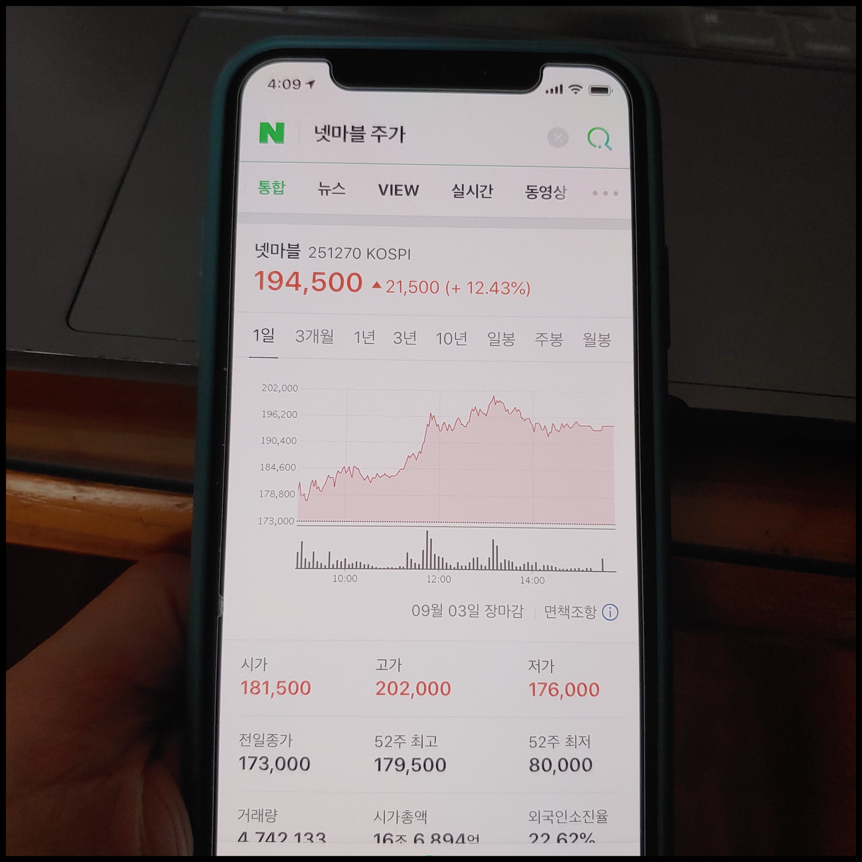 [사진 = 9월 3일 주식 시장에서 화제가 되었던 종목은 넷마블 주가 입니다. 전날보다 12.43% 오른 194,500원에 마쳤습니다. 넷마블은 빅히트 엔터테인먼트의 2대 주주 입니다. 빅히트 엔터테인먼트 상장이 이슈가 되면서 넷마블 주가가 올랐습니다. (C) 네이버 앱]