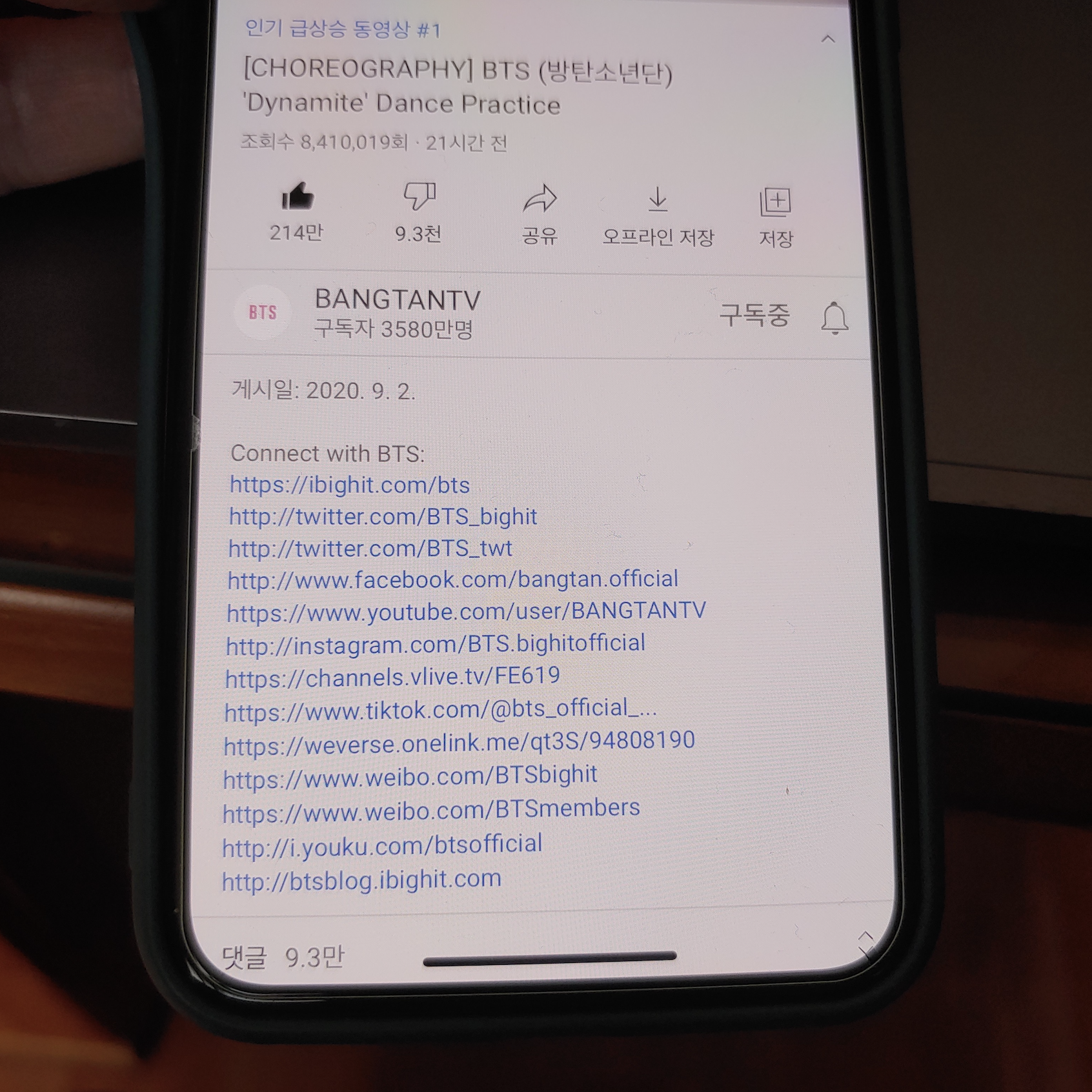 [사진 = 방탄소년단 공식 유튜브에서 공개했던 Dynamite 안무 영상이 한국 유튜브 인기 급상승 동영상 1위 기록중입니다. (C) BANGTANTV 공식 유튜브]