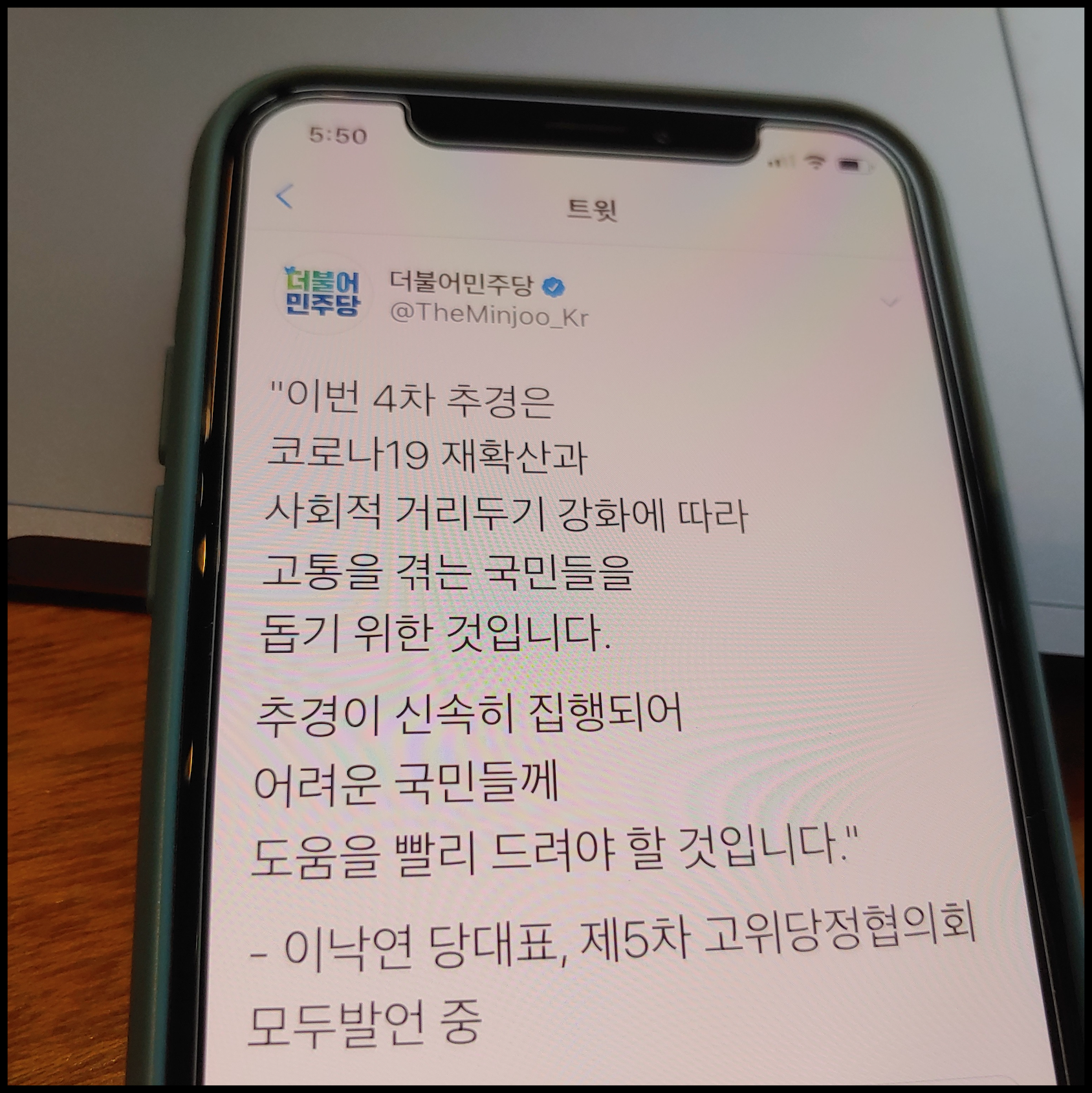 [사진 = 더불어민주당 공식 트위터는 9월 6일 게시물을 통해 이낙연 당대표의 제5차 고위 당정협의회 모두 발언 중에 일부를 공개했습니다. 이낙연 대표가 4차 추경을 언급한 것이 눈에 띕니다. 4차 추경의 목적이 2차 재난지원금이기 때문입니다. 추경 규모는 7조원 중반으로 알려졌으며 고용취약계층에 대한 2차 긴급고용안정지원금 지원, 매출 감소 소상공인을 위한 소상공인 새희망자금 지원, 저소득층 대상의 긴급생계비 지원 추진에 대해서 언급됐습니다. 참고로 1년에 추경 4차례 가졌던 것은 59년 만에 처음이라고 합니다. (C) 더불어민주당 공식 트위터]
