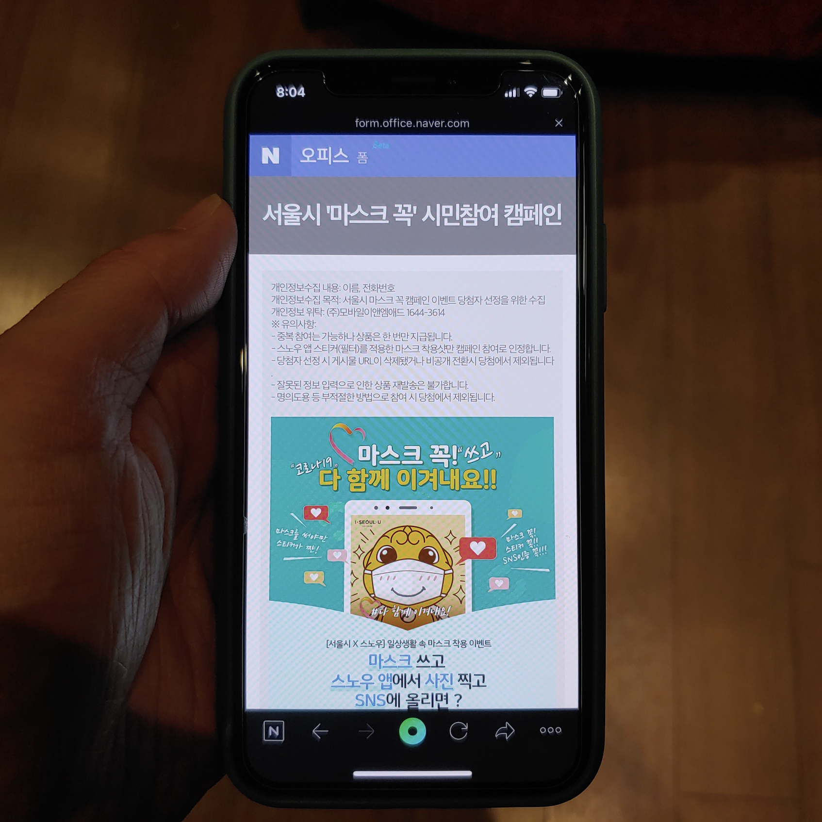캠페인 응모하려면 이벤트 페이지에서 '경품응모하기'라는 곳으로 접속하면 됩니다. 그러면 네이버 오피스 폼이 뜨면서 서울시 '마스크 꼭' 시민참여 캠페인이 뜹니다.