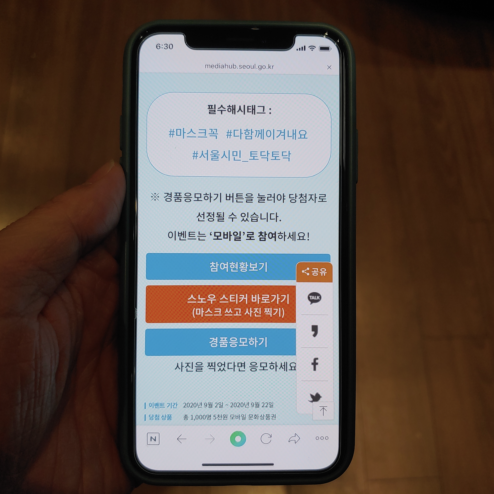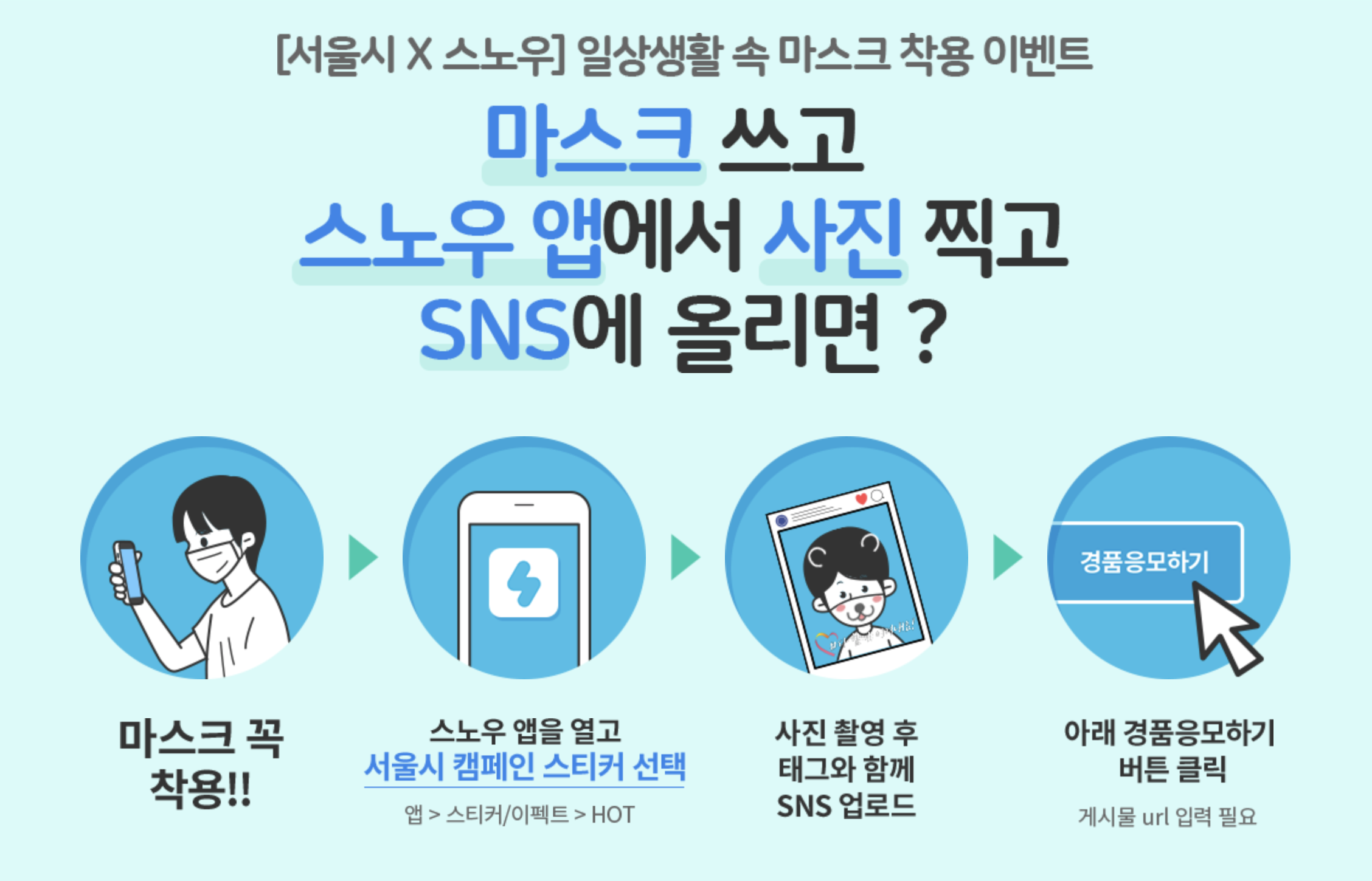 캠페인 참여 방법 이렇습니다. 마스크 착용한 뒤 스노우 앱에서 서울시 캠페인 스티커 선택하면 됩니다.(앱 > 스티커/이펙트 > HOT) 사진을 찍으면 제시된 해시태그와 함께 SNS에 업로드한 뒤 경품 응모하시면 됩니다.