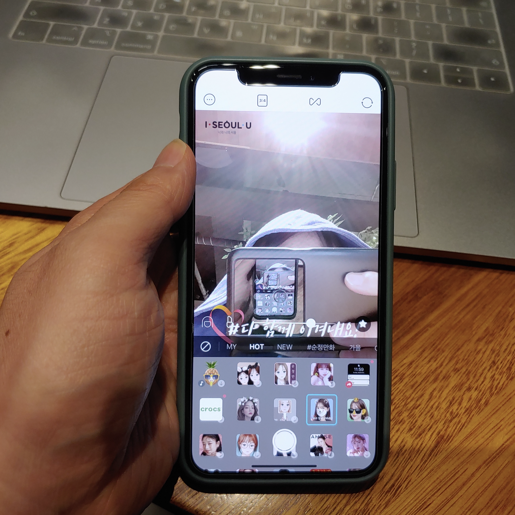 그 이후에는 스노우 앱에 접속하여 셀카 촬영하면 되는데 여기서 서울시 캠페인 스티커 찾으면 됩니다. 스티커/이펙트에 있는 HOT 영역에서 마스크 착용한 스티커를 찾으면 됩니다.