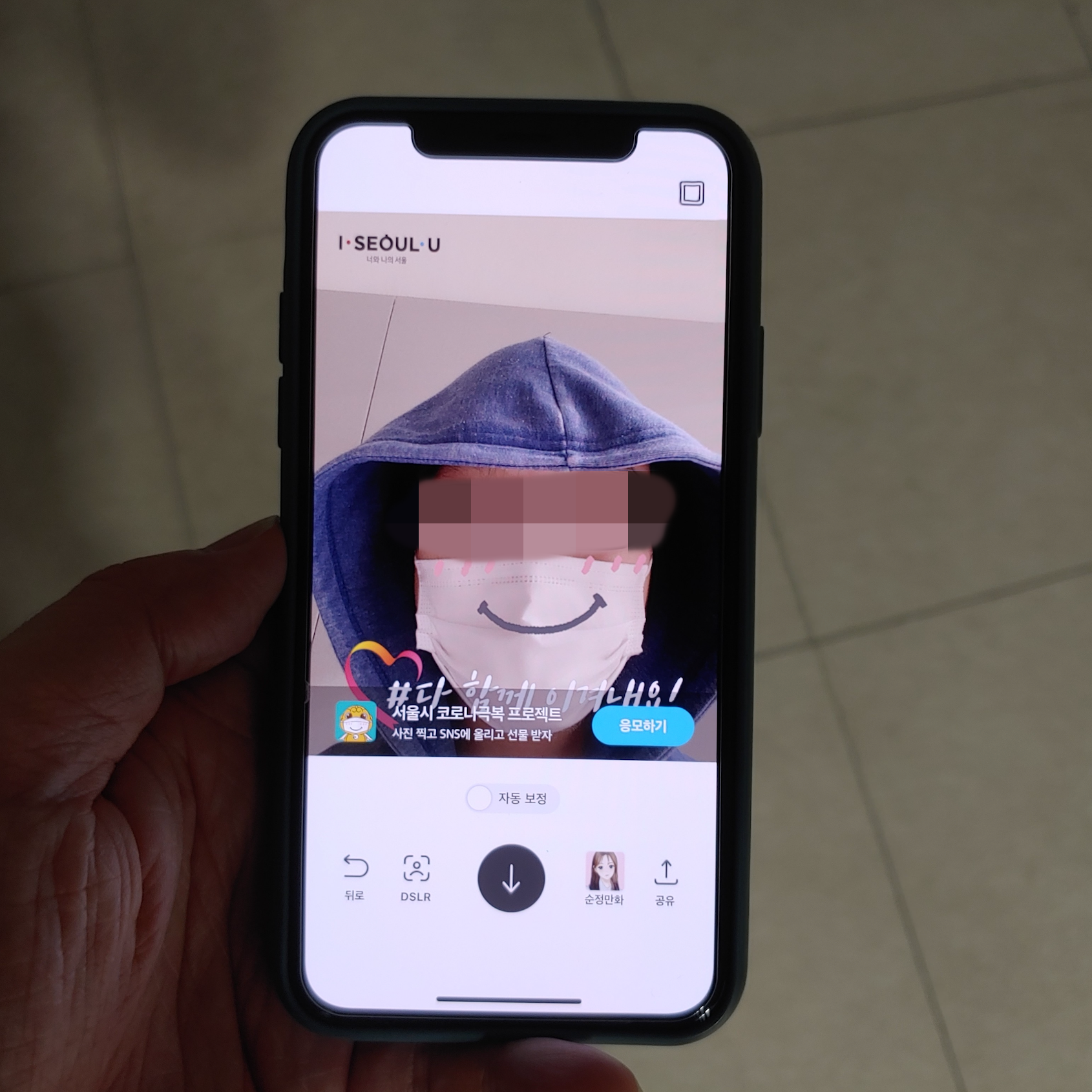 이렇게 셀카를 찍었습니다. 그랬더니 서울시 코로나 극복 프로젝트 문구가 뜨면서 서울시 마스크 꼭 캠페인 응모가 안내됐습니다.