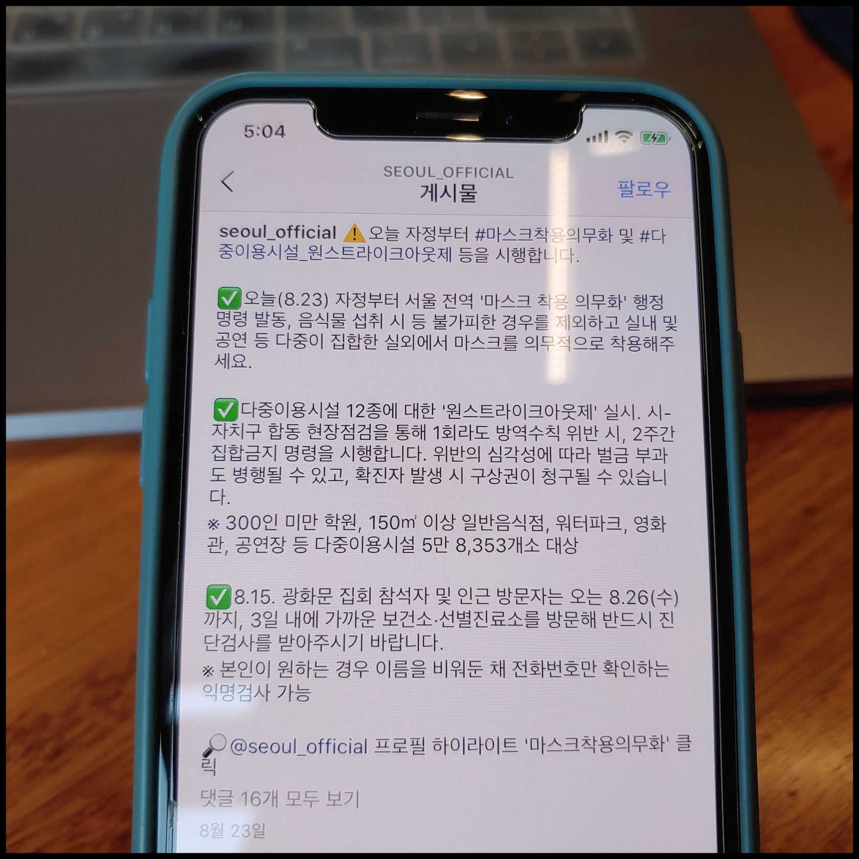 서울시는 지난 8월 24일(8월 23일 자정)부터 '마스크 착용 의무화' 행정 명령 발동했습니다. 일상적 사생활(집 또는 실내 분할된 공간에 혼자 있거나 가족들과 함께 있을 때를 말함)이나 음식물 섭취 등 불가피한 경우를 제외하면 실내(운송수단 포함) 및 실외(집회 등 다중이 집합한 경우)에서 반드시 마스크 착용해야 합니다. 서울에 거주하거나 또는 서울 행정구역 내를 방문하는 사람이라면 반드시 마스크 의무착용해야 합니다. 아울러 다중이용시설 12종에 대해서 원스트라이크아웃제가 실시되기 때문에 만약 방역수칙을 1회라도 위반했을 경우 2주 동안 집합금지 명령 시행되며 위반의 심각성이 커질 경우 벌금 부과, 확진자가 발생할 경우 구상권 청구될 수 있다고 합니다.