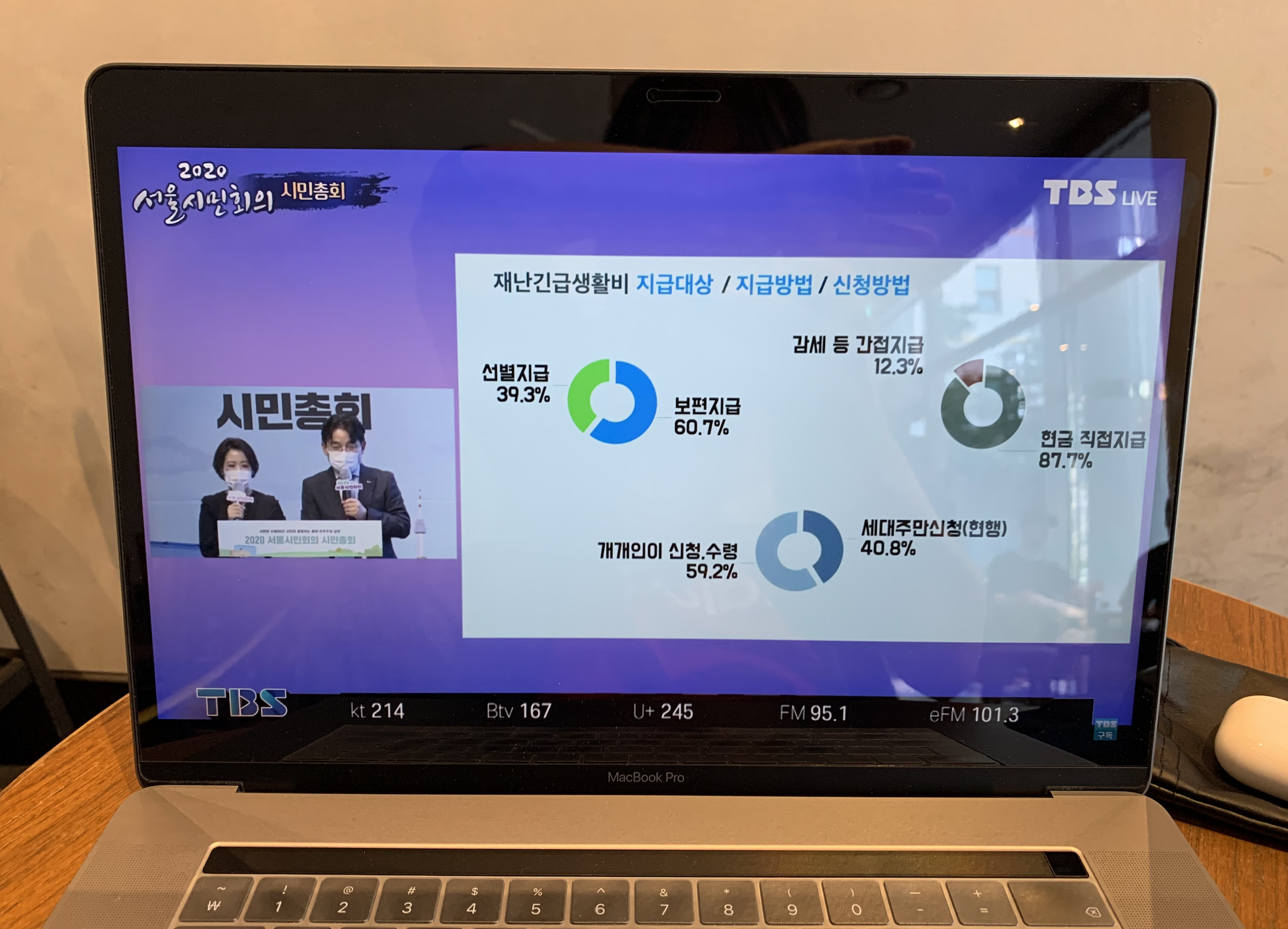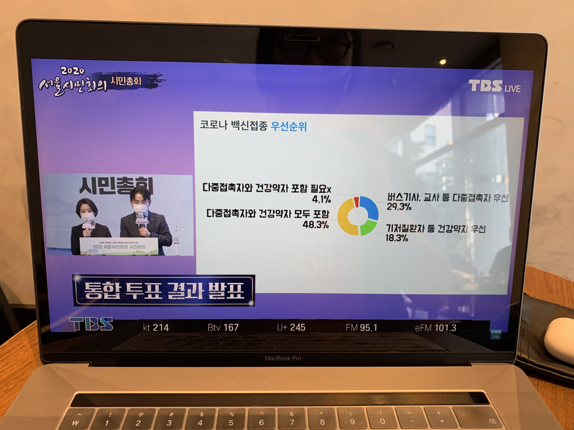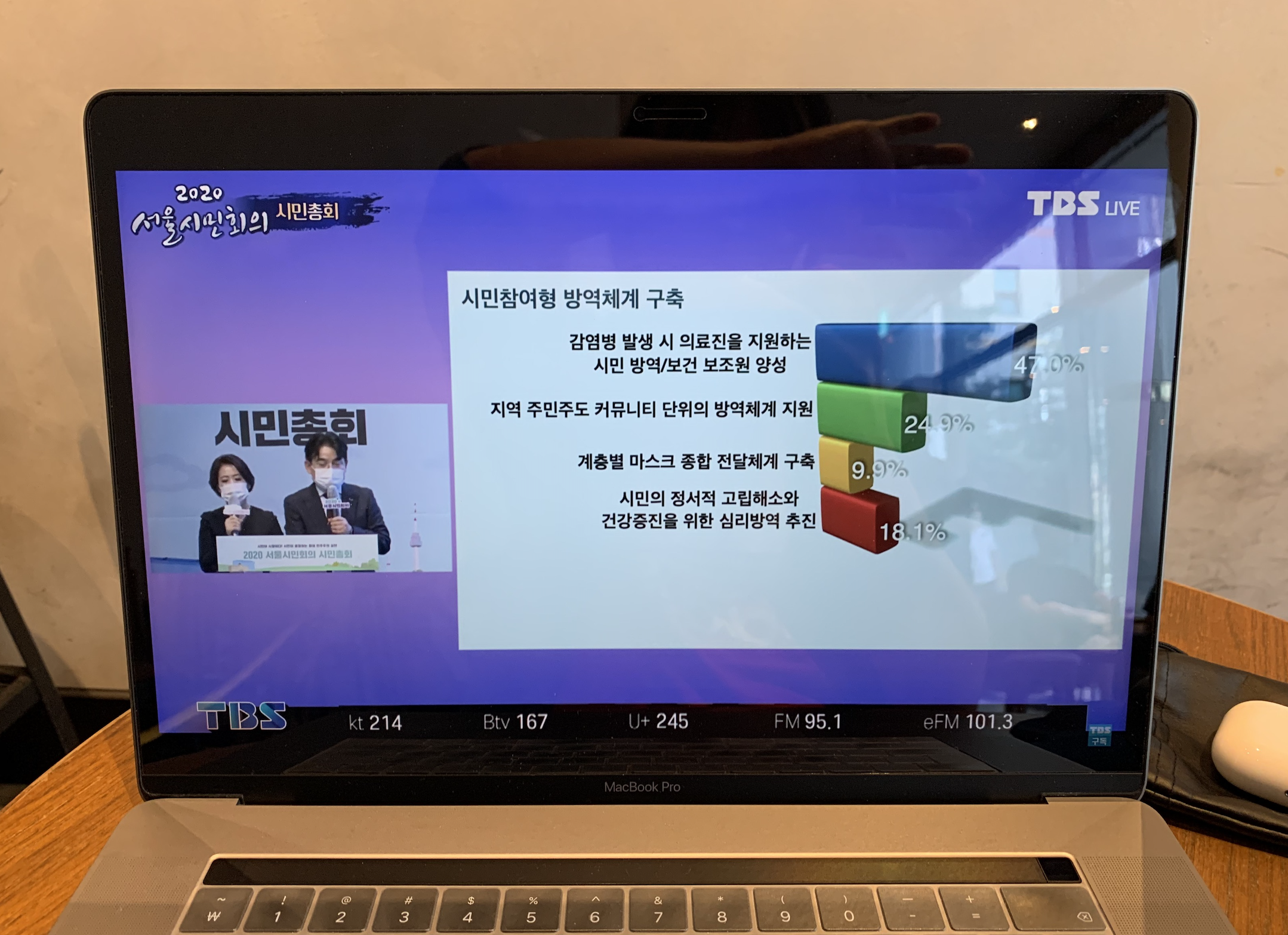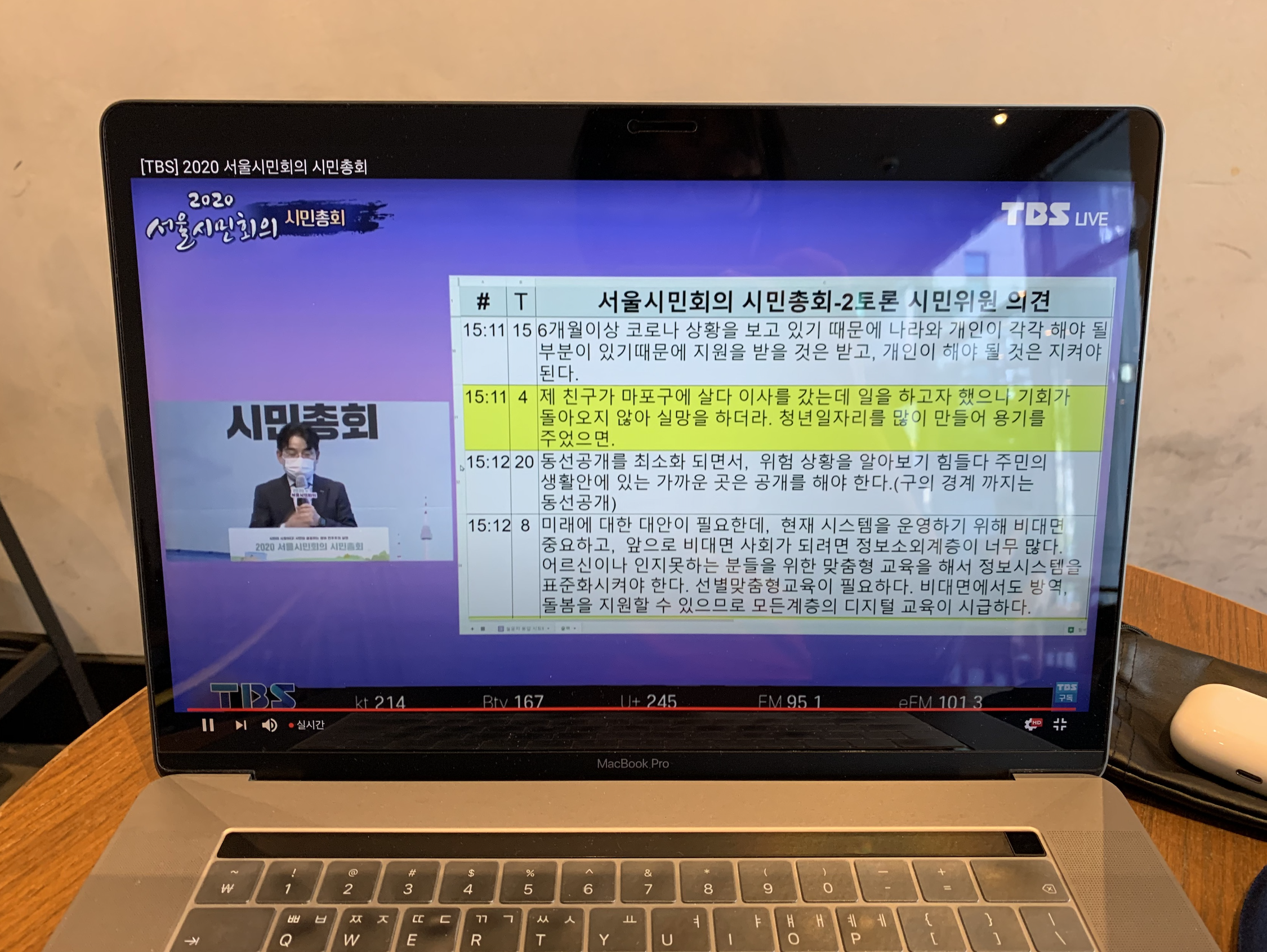 개인적으로 이번 총회에서 흥미로움을 느꼈던 포인트는 온오프라인을 동시에 활용했다는 점입니다. 현장토론에 참석한 시민위원이 40명의 소규모로 참석했다면 현장에 올 수 없는 시민위원들은 줌(Zoom)을 통해 총회에 참여하여 토론했습니다. 코로나19 시국이라 기존과 다른 방식의 진행이 가능했습니다. 온라인과 오프라인을 동시에 활용하면서 현장에 오지 못하는 시민위원들의 참여가 가능했다는 점에서 더 많은 사람들의 목소리를 들을 수 있는 기회를 접할 수 있었습니다. 이러한 진행 과정이 TBS 시민의 방송 유튜브 채널을 통해 생중계 되면서 시민위원이 아닌 사람도 2020 서울시민회의 시민총회 실시간 진행 상황을 볼 수 있었습니다.