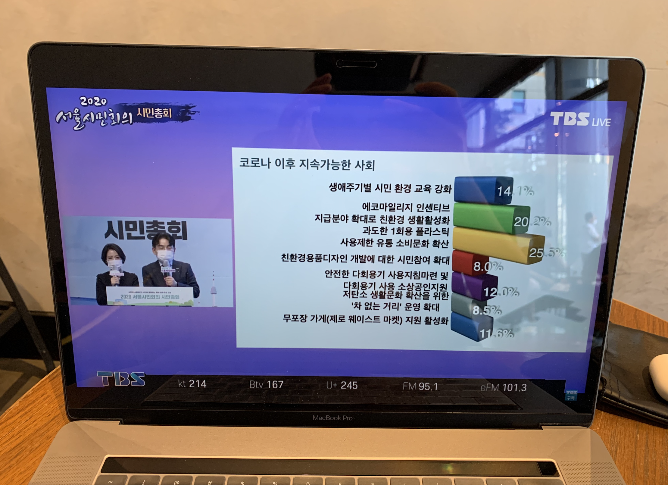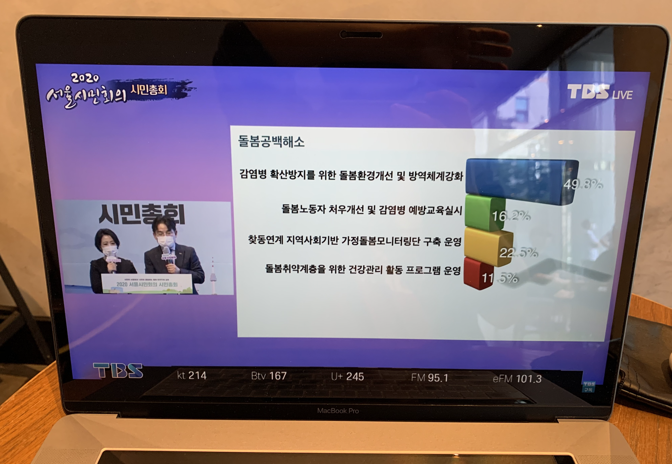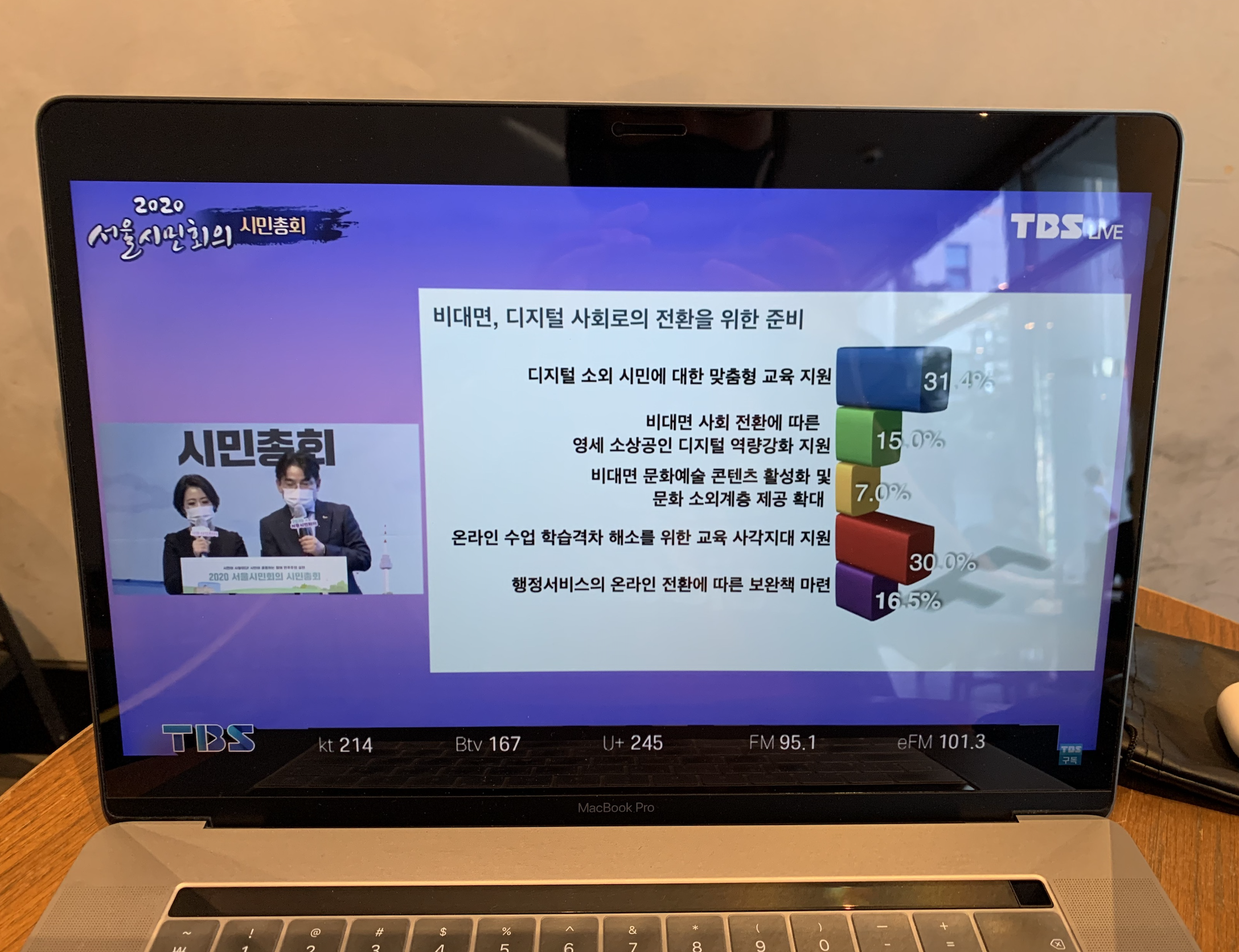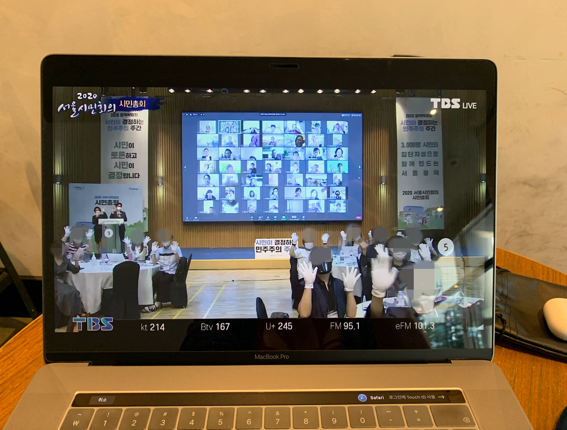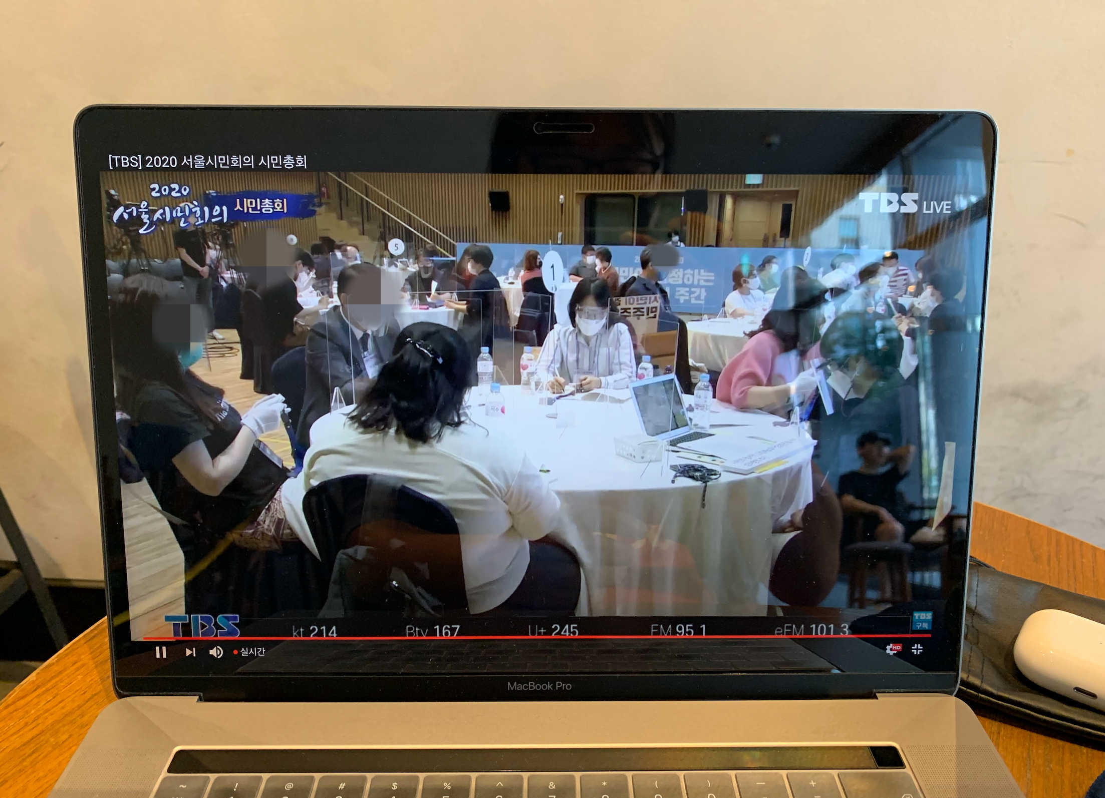 개인적으로 이번 총회에서 흥미로움을 느꼈던 포인트는 온오프라인을 동시에 활용했다는 점입니다. 현장토론에 참석한 시민위원이 40명의 소규모로 참석했다면 현장에 올 수 없는 시민위원들은 줌(Zoom)을 통해 총회에 참여하여 토론했습니다. 코로나19 시국이라 기존과 다른 방식의 진행이 가능했습니다. 온라인과 오프라인을 동시에 활용하면서 현장에 오지 못하는 시민위원들의 참여가 가능했다는 점에서 더 많은 사람들의 목소리를 들을 수 있는 기회를 접할 수 있었습니다. 이러한 진행 과정이 TBS 시민의 방송 유튜브 채널을 통해 생중계 되면서 시민위원이 아닌 사람도 2020 서울시민회의 시민총회 실시간 진행 상황을 볼 수 있었습니다.