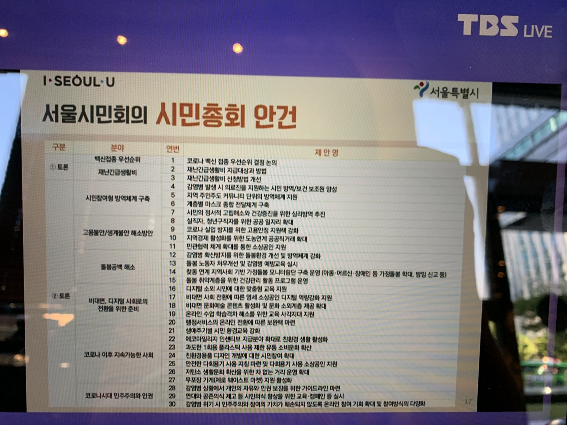 서울시민회의 시민총회 안건 30개 이렇습니다. 분야는 8개로 분류됐습니다.
