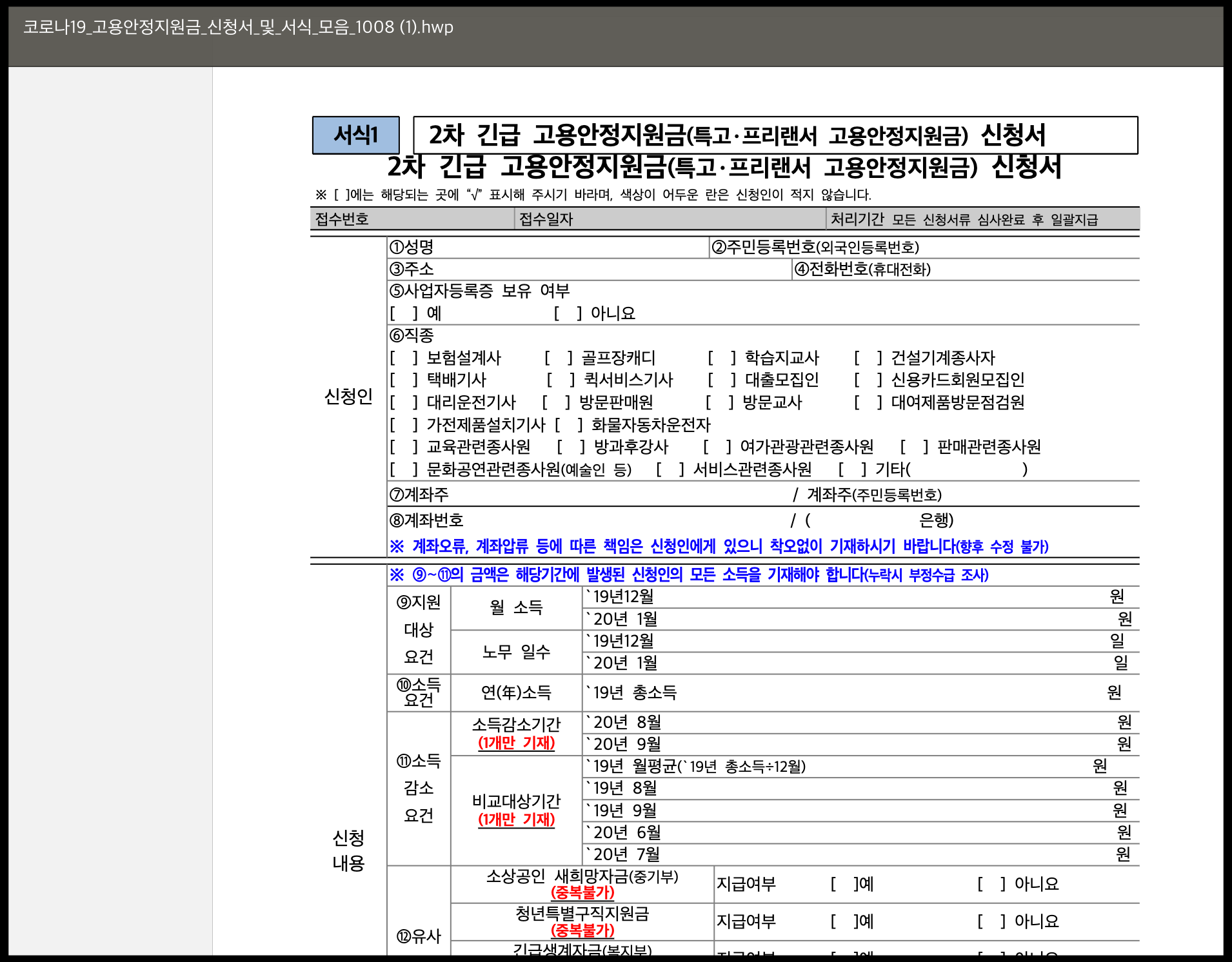 서식1은 2차 긴급고용안정지원금(특고, 프리랜서 고용안정지원금) 신청서입니다. 지원금 신청하실 때 여러 서류들을 작성하게 될 텐데 해당되는 서류 선택해서 쓰시면 되니다.