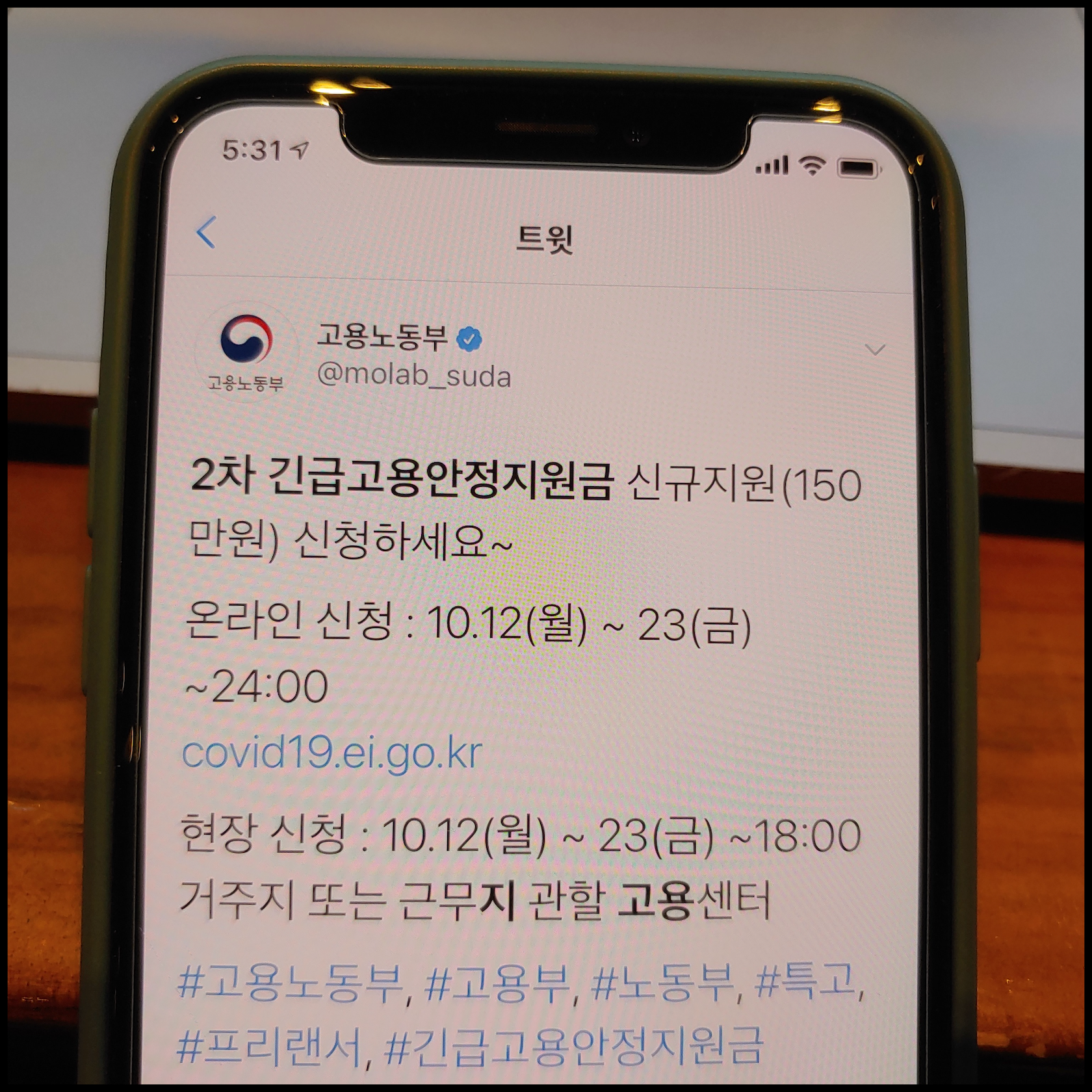 [사진 = 고용노동부 공식 트위터에서는 2차 긴급고용안정지원금 신규지원 신청 관련 게시물을 올렸습니다. 지원금이 150만원이라는 점에서 특고 및 프리랜서 분들의 관심이 클 것으로 보입니다. 150만원은 신청인원 예산 초과 시 우선순위 선정 및 지급된다는 점 참고하시기 바랍니다. 다만, 1차 지원금 지원 받지 않았거나 고용보험 미가입자가 해당된다는 점을 참고할 필요가 있습니다. 해당 게시물 키보드 입력 부분에서는 현장 신청 시작일이 10월 12일로 나왔으나 실제로는 10월 19일부터 시작됩니다. 19일에 출생연도 홀수 신청 가능하다면 20일에는 짝수 신청, 21~23일에 짝홀수 관계없이 신청할 수 있습니다. (C) 고용노동부 공식 트위터]