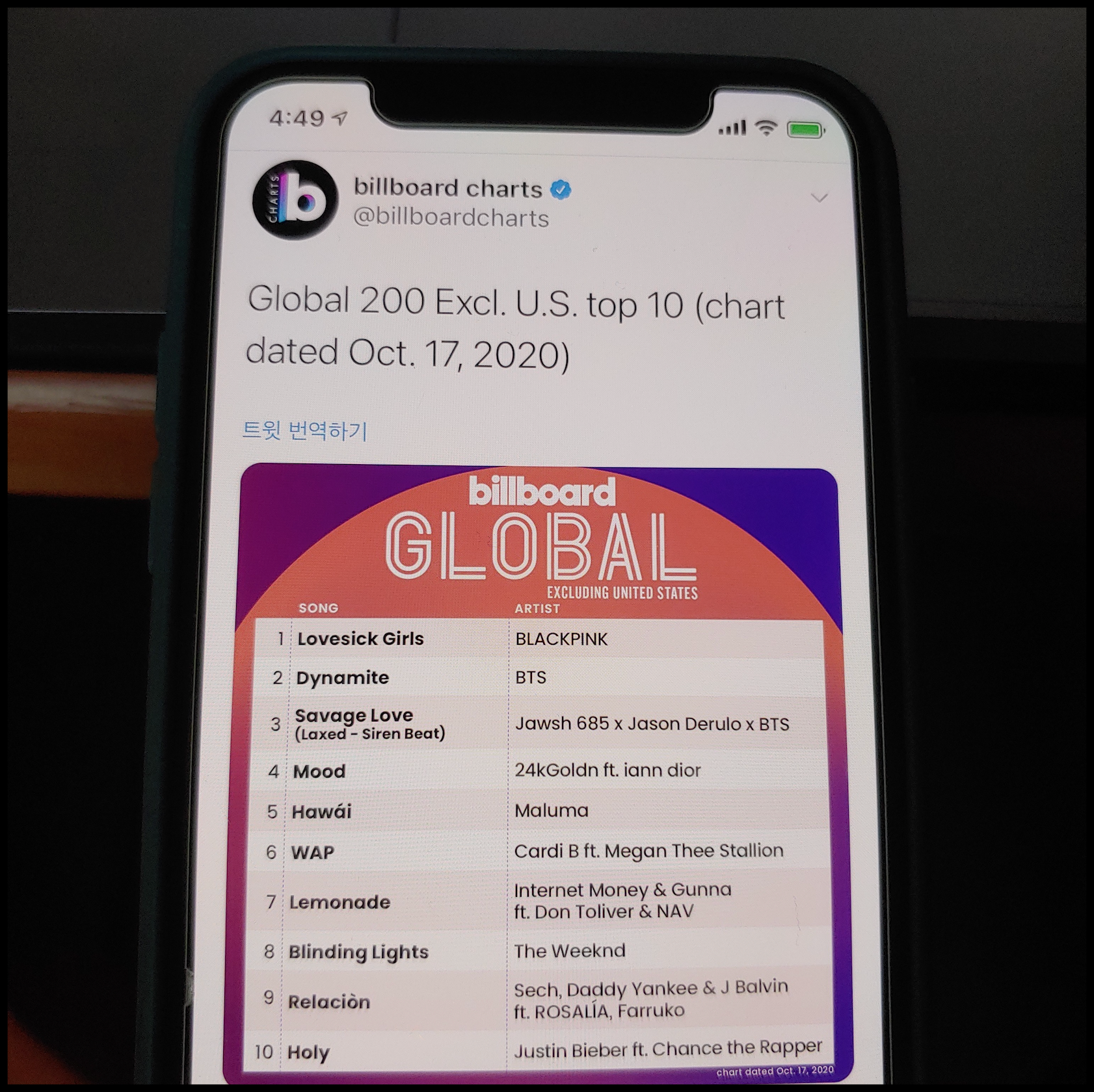 [사진 = 빌보드 공식 트위터에서는 최근 빌보드 글로벌 200 미국 제외 차트 공개했습니다. 블랙핑크 Lovesick Girls 1위, 방탄소년단 Dynamite 2위, 조시 685 & 제이슨 데룰로 & 방탄소년단 Savage Love(Laxed - Siren Beat) 3위 달성했습니다. 블랙핑크 빌보드 기록 행진이 얼마나 강세를 나타내는지 알 수 있습니다. 그와 더불어 블랙핑크와 방탄소년단이 전 세계 적으로 많은 인기를 얻고 있음이 입증됐습니다. (C) 빌보드 공식 트위터]