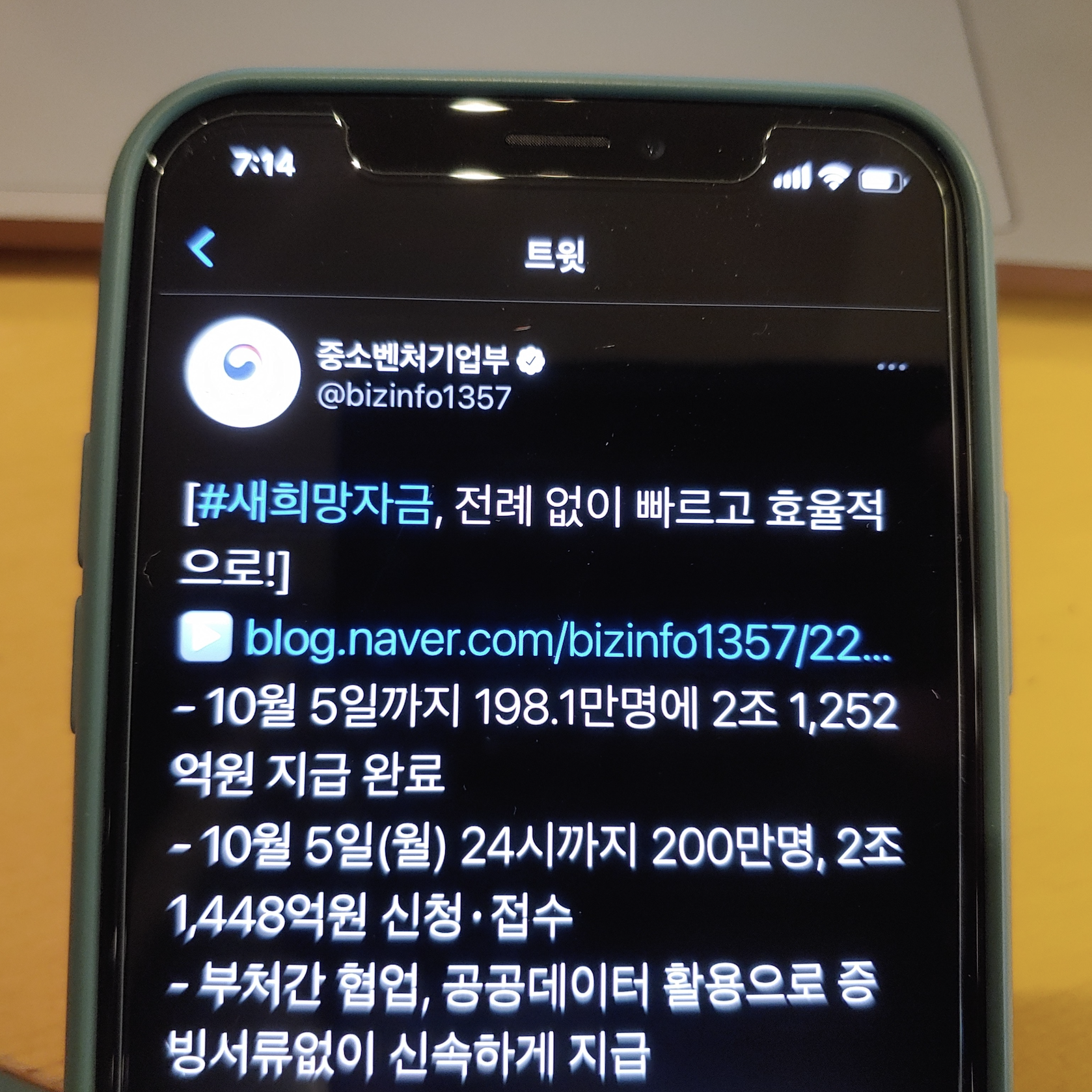 [사진 = 중소벤처기업부 공식 트위터에서는 지난 10월 5일까지 198.1만명에게 2조 1,252억원 지급 완료되었다고 합니다. 이 대목에서 소상공인 새희망자금 지급일 어떻게 되는지 대략 파악할 수 있습니다. 지난 9월말에 신청 및 지급 되었으니 말입니다. 이번 2차 신청 같은 경우 지급 완료 시기가 그리 길지 않을 것으로 예상됩니다. (C) 중소벤처기업부 공식 트위터]