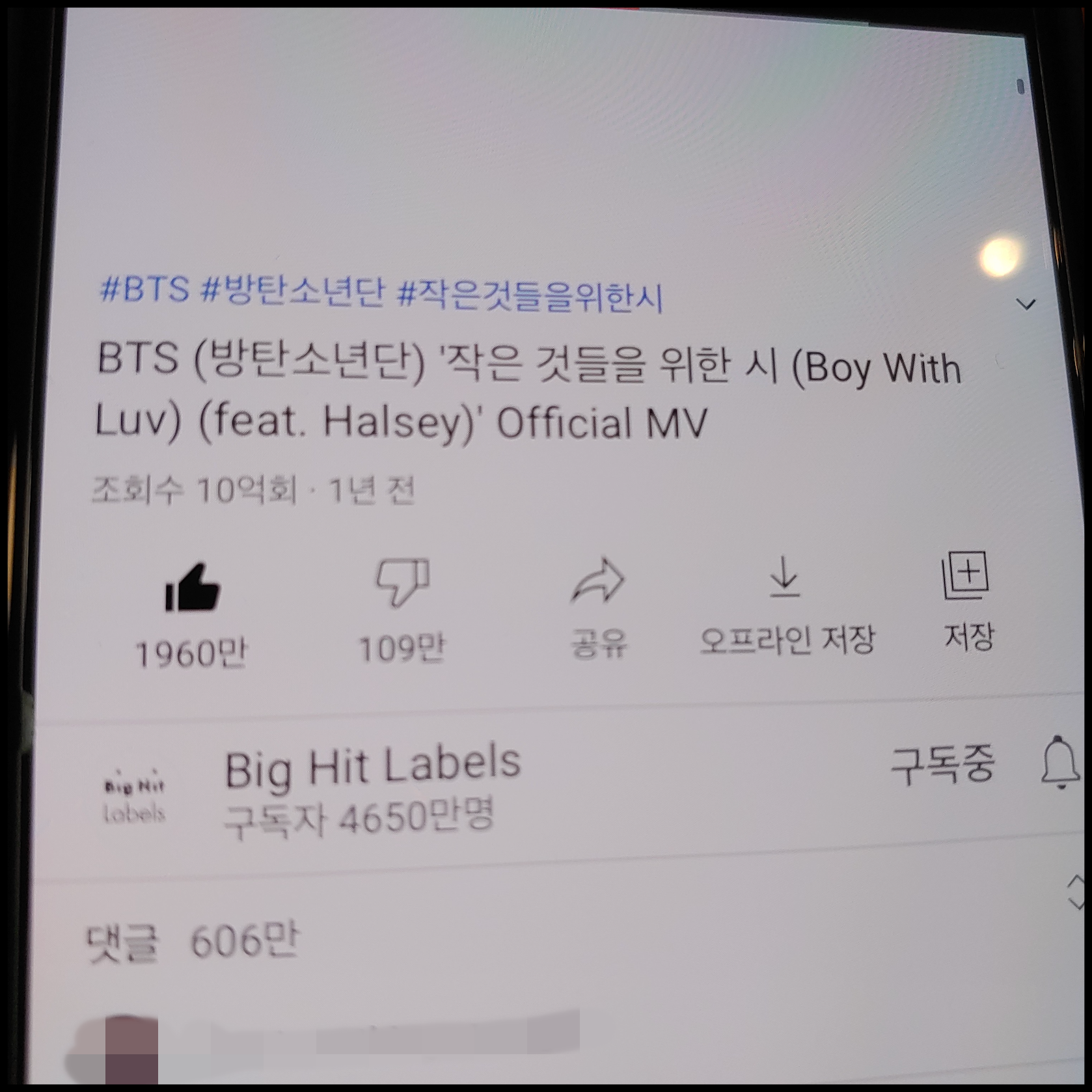 [사진 = 방탄소년단이 2019년 4월 12일 발매했던 작은 것들을 위한 시(Boy With Luv)(feat. Halsey) 뮤직비디오가 최근 유튜브 조회 수 10억 뷰 돌파했습니다. 2017년 히트곡 DNA 11억 뷰에 이어 유튜브 조회 수 두 번째 10억 뷰 돌파를 달성했습니다. K-POP 보이그룹이 유튜브 10억 뷰 돌파한 것은 방탄소년단이 최초이며 그것도 두 곡을 보유했습니다. 작은 것들을 위한 시, DNA는 공통점이 있습니다. 작곡 및 작사 명단에 피독이 참여했습니다. 그와 더불어 빅히트 방시혁 의장 및 대표 프로듀서, 방탄소년단 멤버 슈가와 RM도 작곡 및 작사에 참여했습니다. 방탄소년단은 슈가, RM, 제이홉이 한국음악저작권협회 정회원으로 승격한 적이 있을 정도로 직접 스스로 작곡 및 작사를 하며 히트곡을 만들어낸 적이 있습니다. (C) Big Hit Labels 공식 유튜브]
