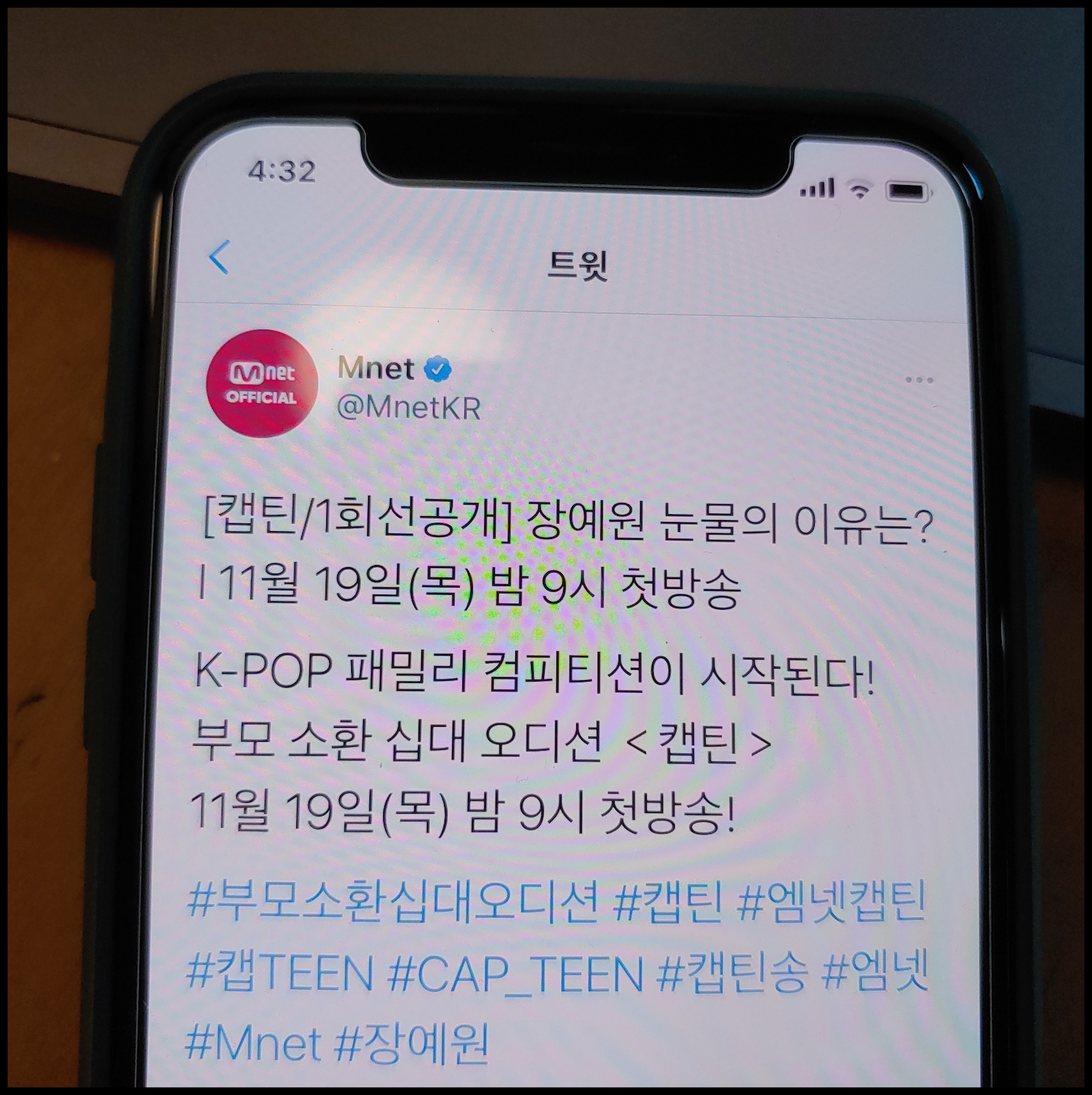[사진 = Mnet 캡틴 1회 오는 2020년 11월 19일 방영 예정입니다. 사진은 저의 스마트폰 달력이며 2020년 11월 19일을 가리킵니다. (C) 나이스블루]