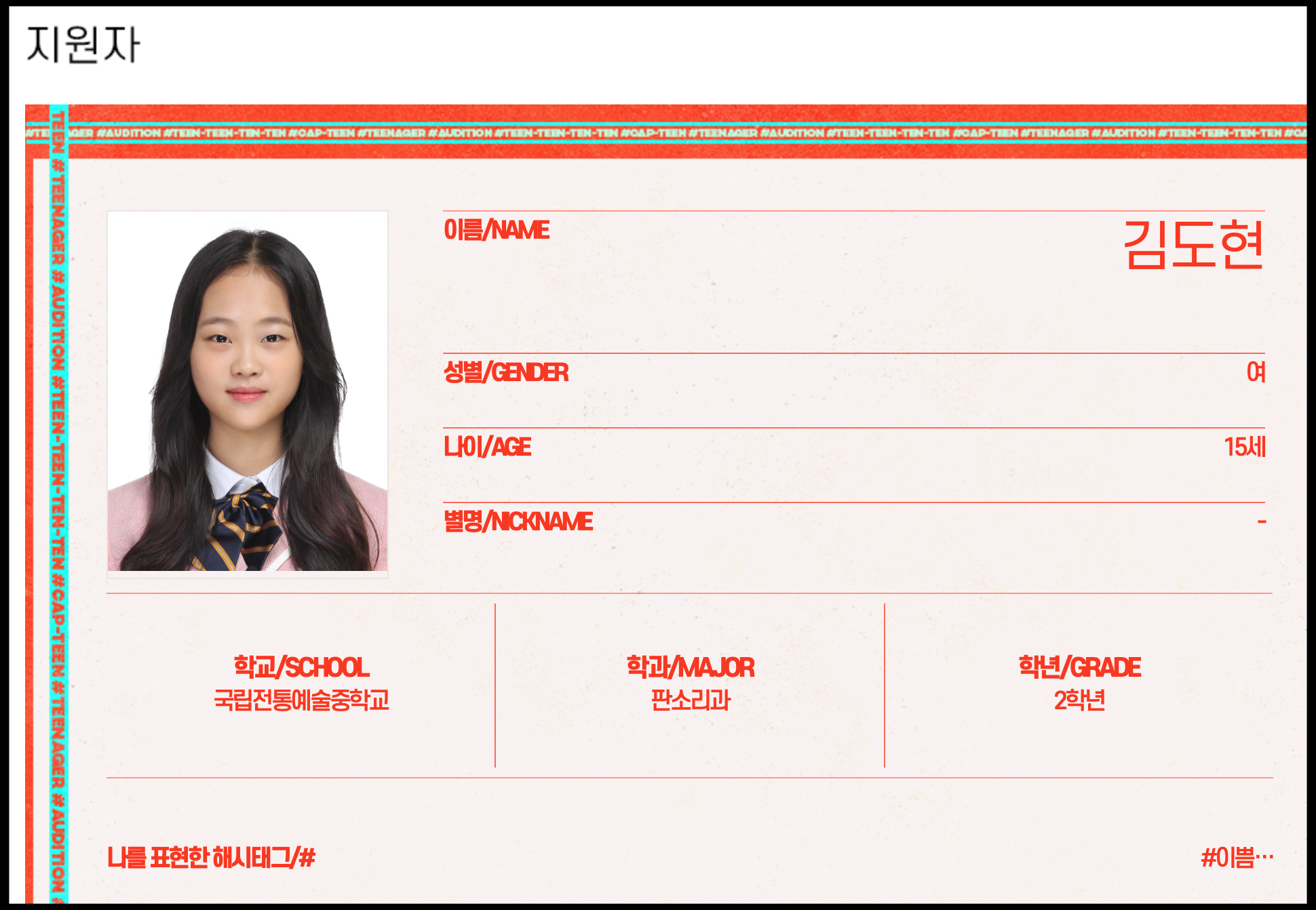 [사진 = 김봉곤 훈장의 딸 김도현 특기는 국악이며 현재 국립전통예술중학교 판소리과 2학년 재학중입니다. 캡틴 김도현 나이 어떻게 되는지 알 수 있을 듯 합니다. 한 가지 주목할 점은 김도현 캡틴 지원 동기가 국악이 아닌 다른 장르에 도전하고 싶었기 때문입니다. 지금까지 국악을 계속 했기 때문에 다른 음악 장르가 익숙할지 알 수 없으나 이 프로그램을 통해 새로운 도전을 하고 싶어한 듯 합니다. 국악인 송소희, 국악인 출신의 트로트 가수 송가인도 MBC 복면가왕에서 트로트가 아닌 장르의 노래로 3라운드 진출했던 적이 있습니다. 대부분 소화했던 노래들이 트로트가 아닌 다른 장르의 노래들이었던 것으로 기억합니다. 다만, 캡틴이 복면가왕과 다른 한 가지가 있다면 캡틴은 서바이벌 및 오디션 프로그램 입니다. (C) Mnet 캡틴 공식 홈페이지 프로필 사진(program.genie.co.kr/cap_teen)]
