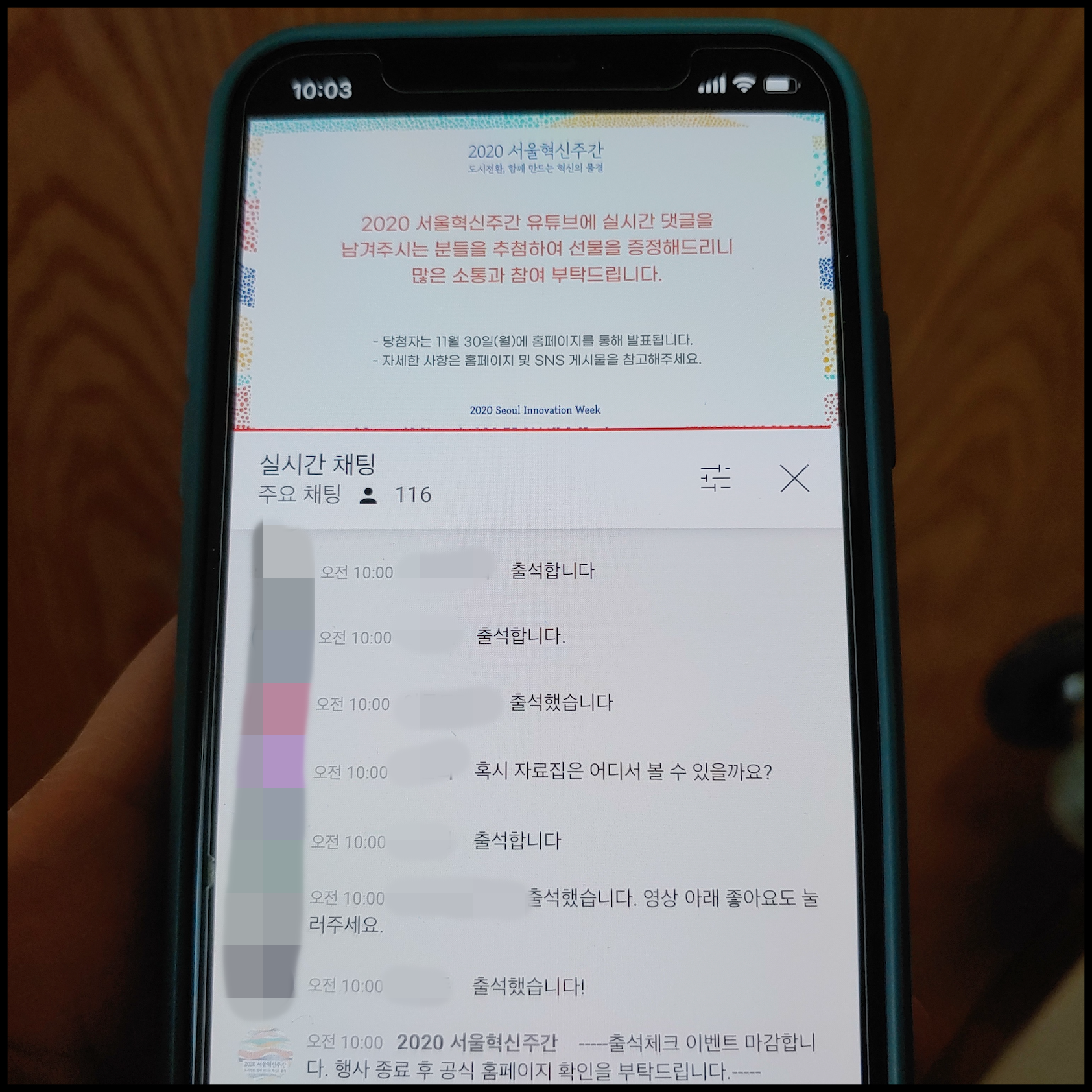 2020 서울 혁신주간 유튜브 생중계 되면서 실시간 채팅이 되는 모습을 볼 수 있었습니다. 출석 이벤트 때문인지 누리꾼들의 참여 열기가 뜨거워진 인상입니다. 영상을 보면서 자신의 의견을 전하고 싶어하는 누리꾼들이 있었습니다. 채널 운영 측에서도 패널토론 중 궁금한 점을 실시간 채팅에 올려달라는 메시지를 남긴 모습을 보면 2020 서울 혁신주간 행사가 누리꾼들의 귀를 기울이겠다는 의도가 있었음을 알 수 있습니다. 유튜브로 온라인 생중계 되는 공개 행사 특성상 사람들에게 보여지기 때문에 시민들의 목소리를 듣기 좋은 상황이 만들어졌습니다.