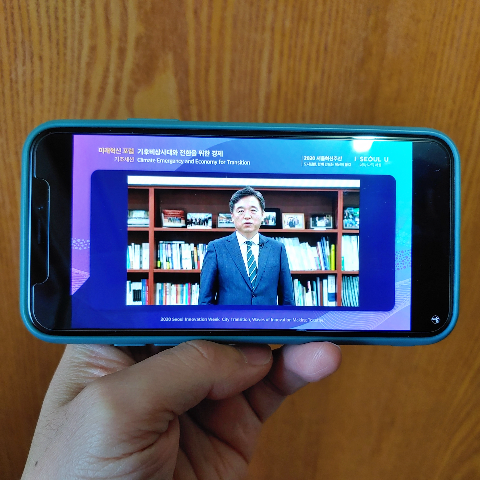 서정협 서울특별시장 권한대행은 환영사를 통해 "코로나19 팬데믹으로 인류는 대전환의 도전속에 놓여있습니다."라고 언급하면서 그동안 우리들에게 익숙했던 관습이나 문화, 가치 체계를 뛰어넘는 대전환만이 기후위기와 생태계 붕괴로 위협받는 인류 생존과 행복을 담보할 수 있다고 언급했습니다. 서울시가 올해 '서울판 그린뉴딜' 도입한 것은 2050년 온실가스 순배출 제로 도시를 목표로 하기 위해서라고 합니다. 하버드대 경제학과 에드워드 글레이져 교수의 "도시는 인류변형을 이끈 최고의 발명품"에 대하여 언급하면서 도시야 말로 구체적인 실천, 사람과 지식의 교류가 끊임없이 이루어지는 문명진화의 거점이 되어야 한다면서 문명의 위기를 정면으로 마주한 지금이야 말로 전환의 기회이자 혁신의 적기라고 했습니다.