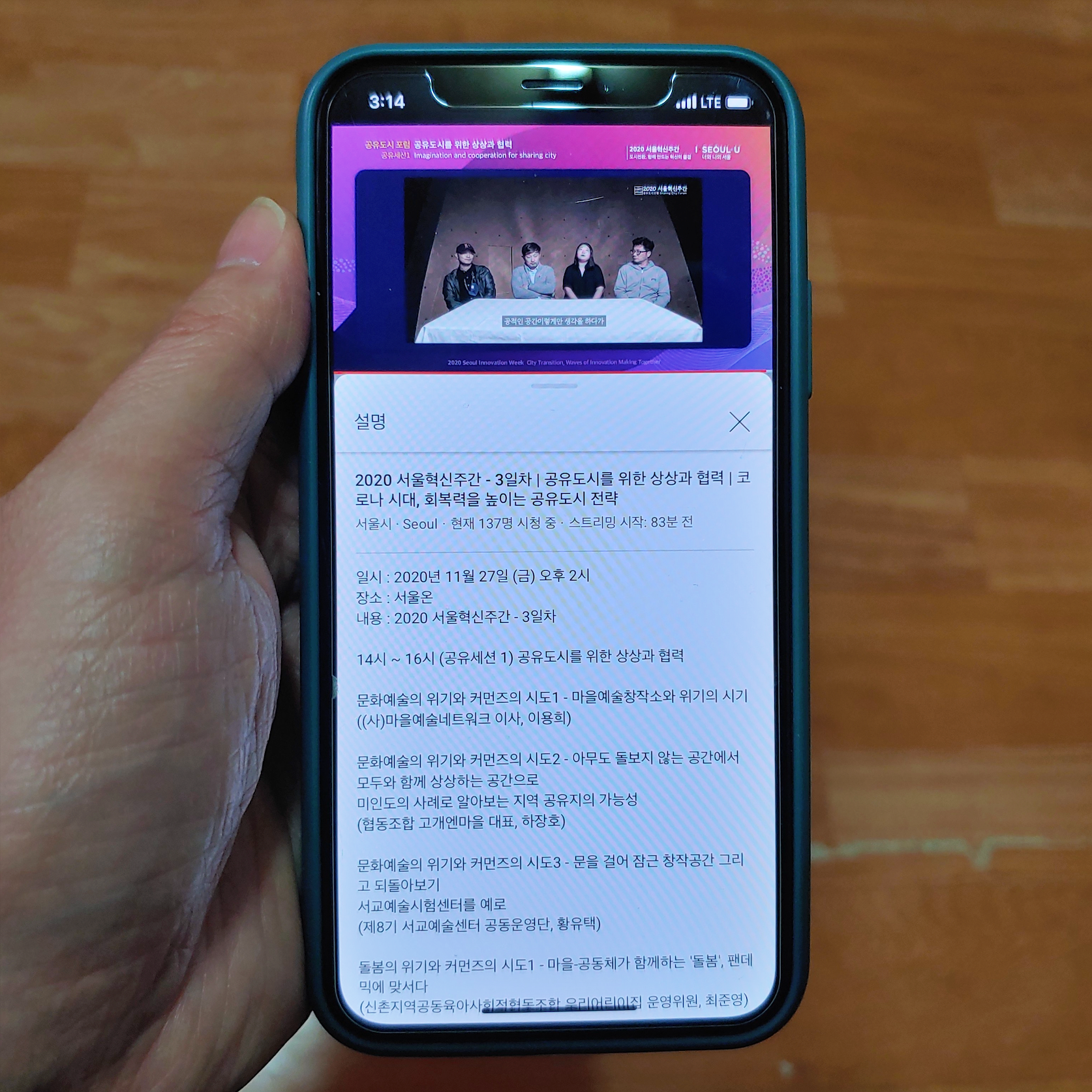 2020 서울 혁신주간 서울시 공식 유튜브 생중계를 통해서 시청 가능했습니다. 해외 명사가 참여했을 때는 동시통역으로 진행되었으며 중국인 명사가 발표했을 때는 한글 자막이 영상에 삽입됐습니다. 이러한 유튜브 생중계를 통해서 행사에 참석하지 않은 누리꾼도 얼마든지 시청 가능했습니다. 그래서인지 댓글을 통해 누리꾼들이 의사표현하는 모습을 볼 수 있었습니다. 코로나 시대 이전이었으면 이러한 풍경이 나타났을지는 알 수 없었을 것 같습니다. 유튜브 라이브 방송을 쉽게 볼 수 있는 것처럼 이제는 온라인 및 비대면 중계가 활성화되었기 때문에 서울시 정책이나 2020 서울 혁신주간 같은 서울시 주최하는 포럼에 대한 시민들의 접근이 더욱 쉬워졌습니다.