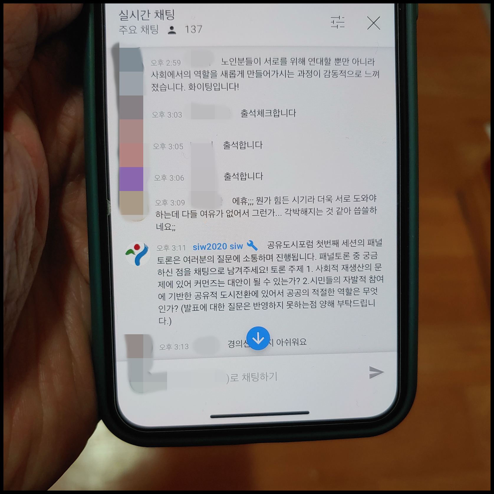 2020 서울 혁신주간 유튜브 생중계 되면서 실시간 채팅이 되는 모습을 볼 수 있었습니다. 출석 이벤트 때문인지 누리꾼들의 참여 열기가 뜨거워진 인상입니다. 영상을 보면서 자신의 의견을 전하고 싶어하는 누리꾼들이 있었습니다. 채널 운영 측에서도 패널토론 중 궁금한 점을 실시간 채팅에 올려달라는 메시지를 남긴 모습을 보면 2020 서울 혁신주간 행사가 누리꾼들의 귀를 기울이겠다는 의도가 있었음을 알 수 있습니다. 유튜브로 온라인 생중계 되는 공개 행사 특성상 사람들에게 보여지기 때문에 시민들의 목소리를 듣기 좋은 상황이 만들어졌습니다.