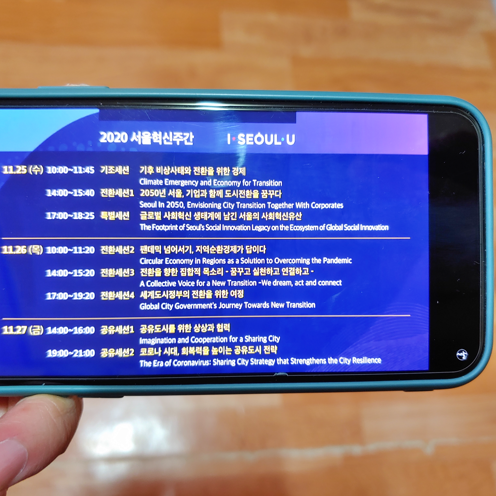 알고보니 이 행사는 서울시가 이전에 주최했던 공유페스티벌, 미래혁신포럼, 전환도시 국제 콘퍼런스를 따로따로 진행했다고 합니다. 이제는 코로나 시대를 맞이하면서 통합으로 개최하게 됐습니다. 그래서인지 도시전환이나 공유도시 등에 대하여 3일 동안 여러 세션이 진행되는 모습을 볼 수 있었습니다. 행사 제목에 '주간'이라는 단어가 있는 이유를 알 수 있을 듯 합니다.