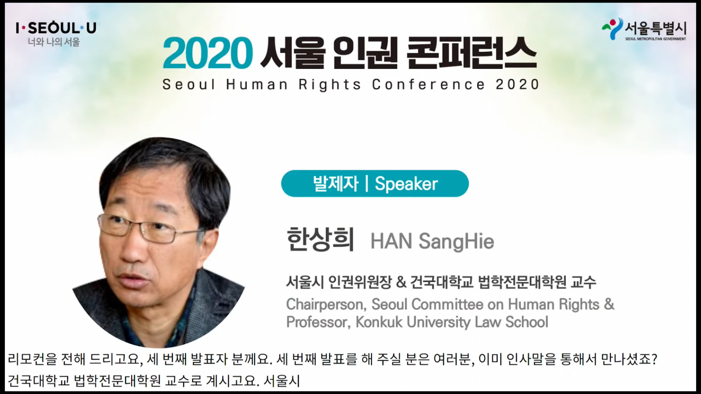 2020 서울 인권 콘퍼런스 방역 완료했으며 방역수칙 준수했습니다. MC를 맡았던 김경미 아나운서와 더불어 서울시청 현장에서 연사자로 참석했던 분들은 콘퍼런스장에서 마스크를 착용했습니다. 그와 더불어 내빈 분들은 서로 간격을 띄워서 앉았으며 의자 사이에 칸막이가 놓여졌습니다.
