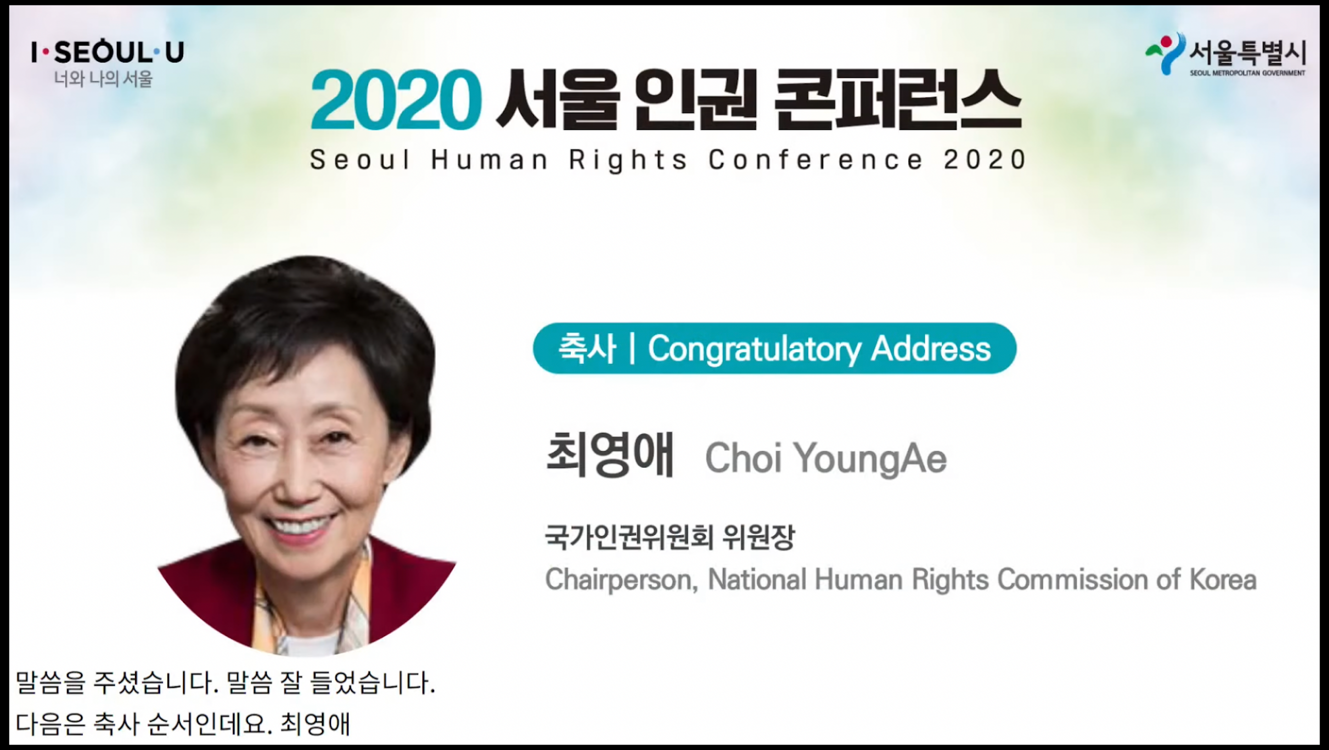 김우영 서울시 정무부시장은 환영사를 통해 서울 인권 콘퍼런스가 2016년부터 매년 개최하여 올해 5회째 맞이했다고 전했습니다. 코로나19에 대해서는 "모두가 한 번도 겪어보지 못했던 사상 초유의 감염병"이라고 표현하면서 시민들의 삶이 힘들어졌음을 전하면서 서울시가 지금의 위기에 대하여 한 단계 성숙해 나가길 기대한다고 합니다. 코로나19 시대에 인권 사각지대에 놓여 있는 아동, 여성, 노인, 외국인 노동자 등 생계 위협 느끼는 인권 취약계층을 위해 서울시가 무엇을 어떻게 할지 그 방법을 찾아보고 고민하는 자리라고 밝혔습니다. 또한 K-방역의 모범도시로서 현재 바이러스와 열심히 싸우고 있다고 하며 시민들의 공동체 정신에 입각해서 어려운 사람이 먼저 구제 받을 수 있도록 하는 인권적 감수성에 기초한 서울시 정책이 될 수 있도록 노력할 것이라고 언급했습니다.