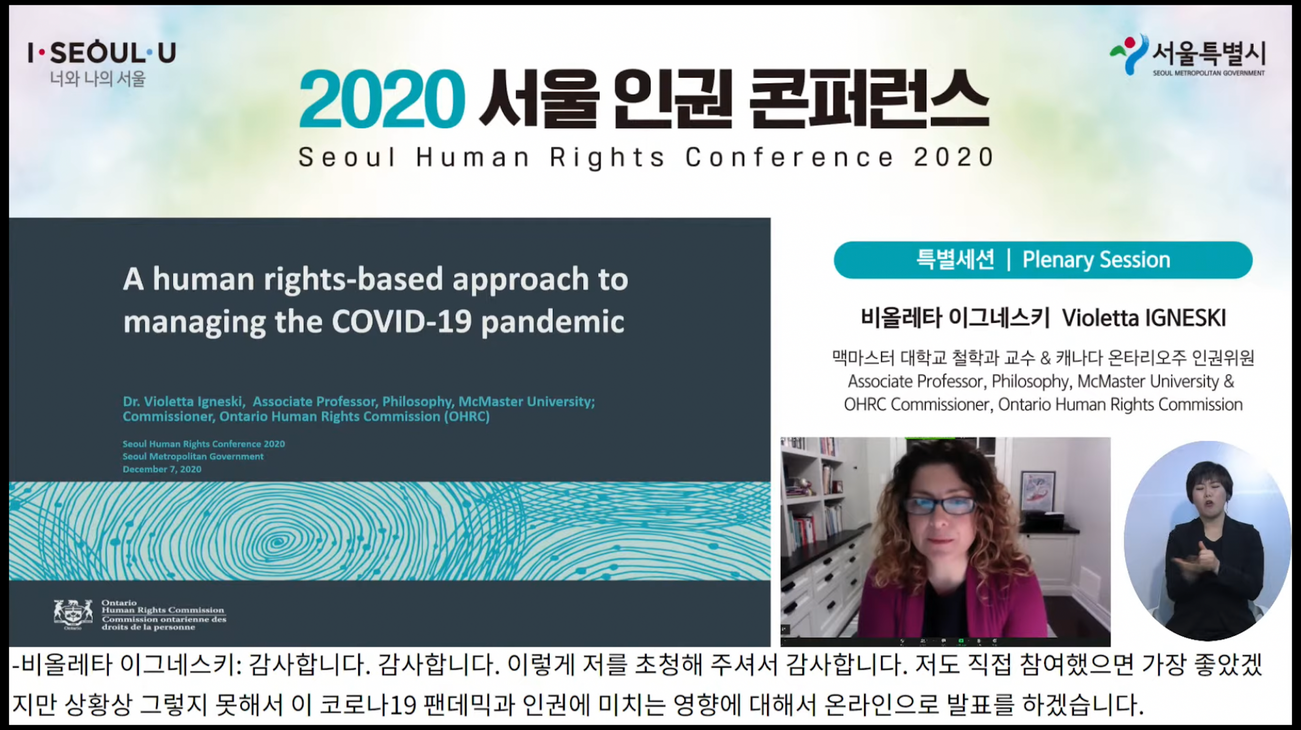 전 세계가 코로나19로 고통에 시달리는 중이며 이는 캐나다도 마찬가지입니다. 비올레타 이그네스키 교수는 주거 및 인터넷에서 소외 당하는 그룹이 생길 수 있으며 온타리오주 인권위원회에서는 인권가이드 발간을 통해 인권을 팬데믹 대응에서 가장 최중심에 둔다고 규정했습니다. (코로나19) 영향을 받은 지역사회에 같이 참여하고 증거 및 데이터 활용한 의사결정 과정, 기획과정에 활용하여 불평등하게 코로나 영향을 받는 모든 사람에게 관심을 갖는다고 언급했습니다. 위원회 내부에서는 코로나19 초창기부터 내부 대응 체계를 구축했으며 코로나19 관련 보고서 작성을 위해 매일매일 정보를 수집하여 지역사회 변화를 트래킹했다고 합니다. 지난 4월에는 팬데믹 대응의 인권 기반 접근권에 대한 정책 성명을 발표했다고 전했습니다. 여기에서는 취약그룹 보호 등 여러 원칙을 적용했습니다. 정부와의 협업을 통해 인권 침해가 벌어지지 않도록 자문을 하는 등의 활동도 한답니다. 인권 보호 및 차별이 발생하지 않도록 하는 원칙에 대해서는 장애를 가진 사람들에게 주거가 확보되어야 한다는 주거의 의무에 대하여 이야기를 했다고 합니다. 한국에 대해서도 짧게 언급했는데. 온타리오주에서의 상황이 한국과 비슷하다고 전했습니다.
