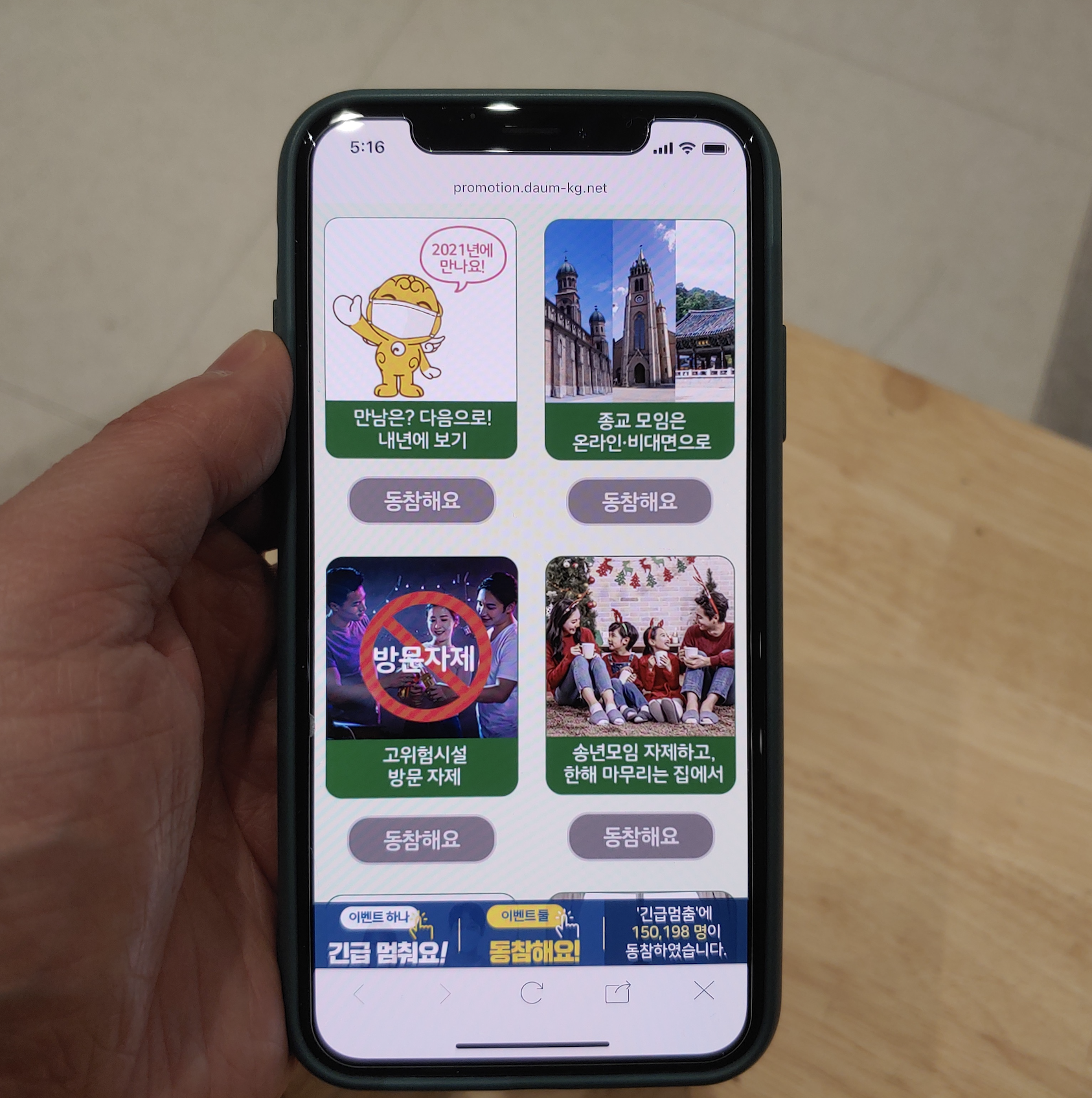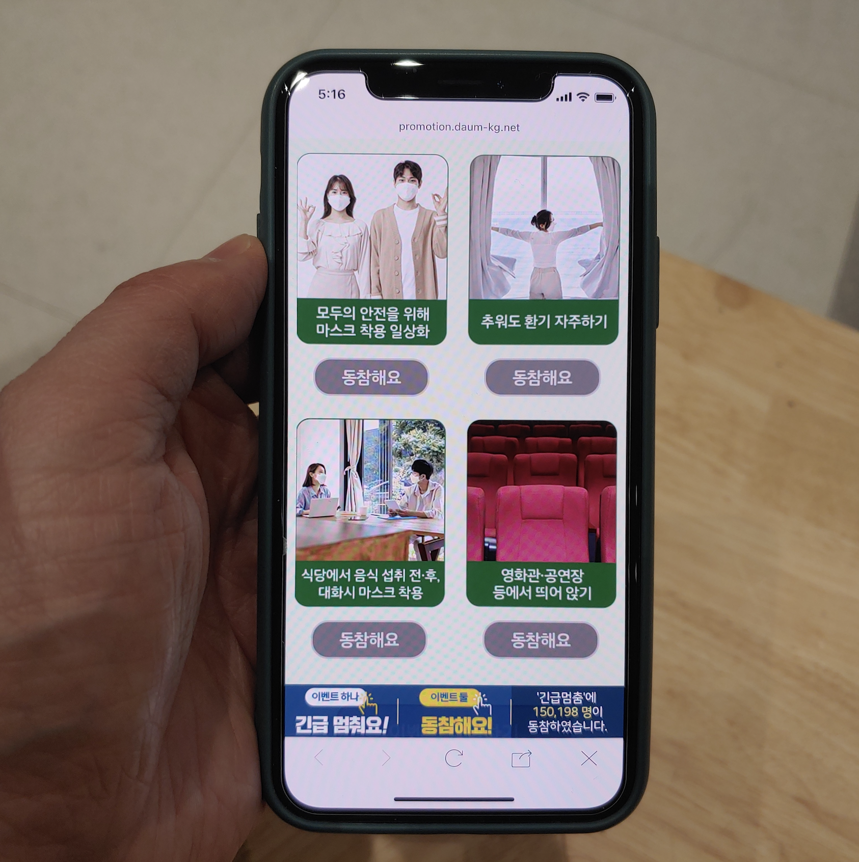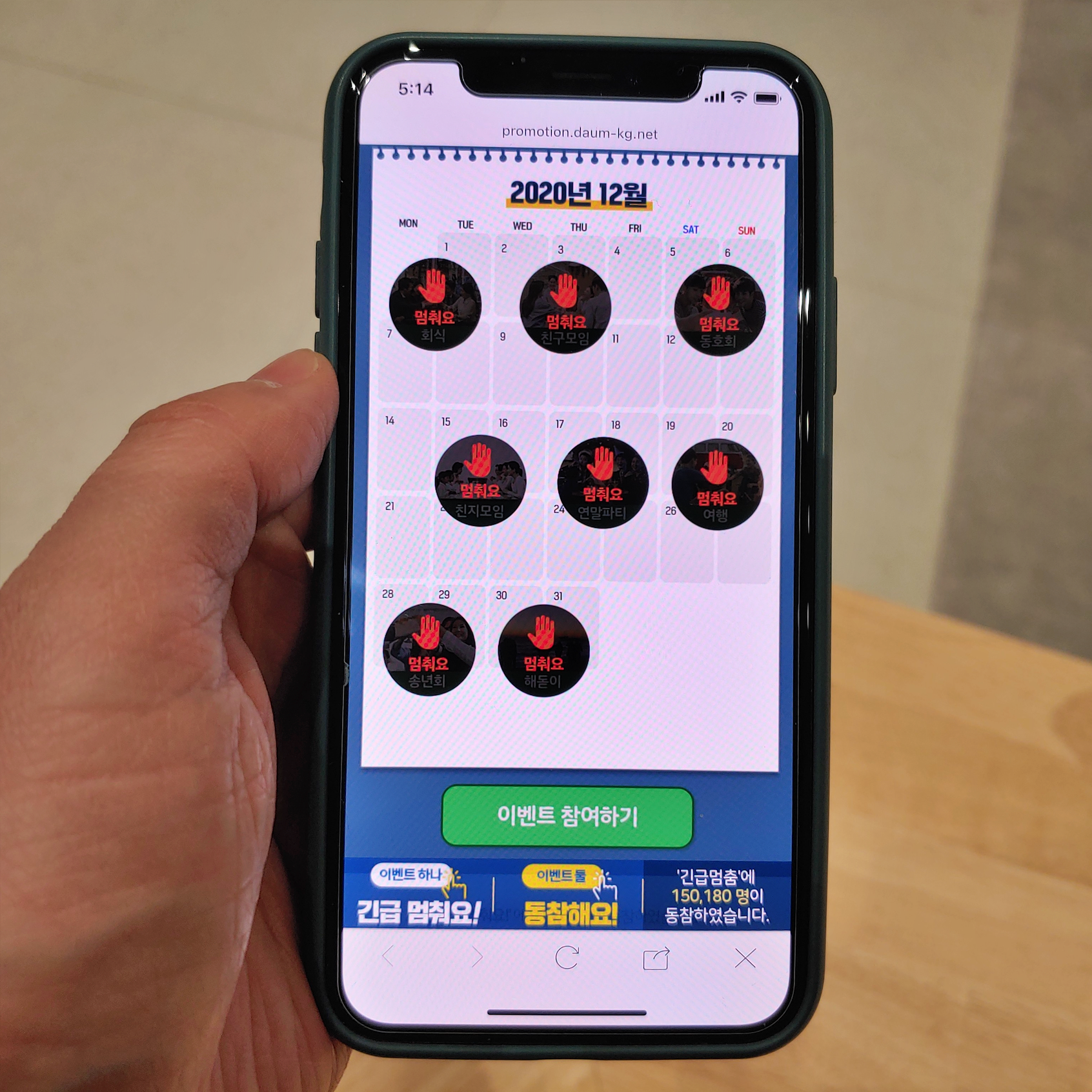 공익캠페인을 통해 긴급 멈춤에 대한 여러분의 생각을 표현하는 이벤트에 참여할 수 있습니다. "긴급 멈춰요!" 이벤트는 지난 11월 26일 목요일부터 12월 27일 일요일까지 참여할 수 있으며 오는 12월 31일 당첨자 발표됩니다. 당첨될 경우 커피 기프티콘 650명 대상으로 받을 수 있습니다. 달력에 표시된 모임에 '멈춰요' 버튼을 순서대로 누르면서 참여하면 됩니다.