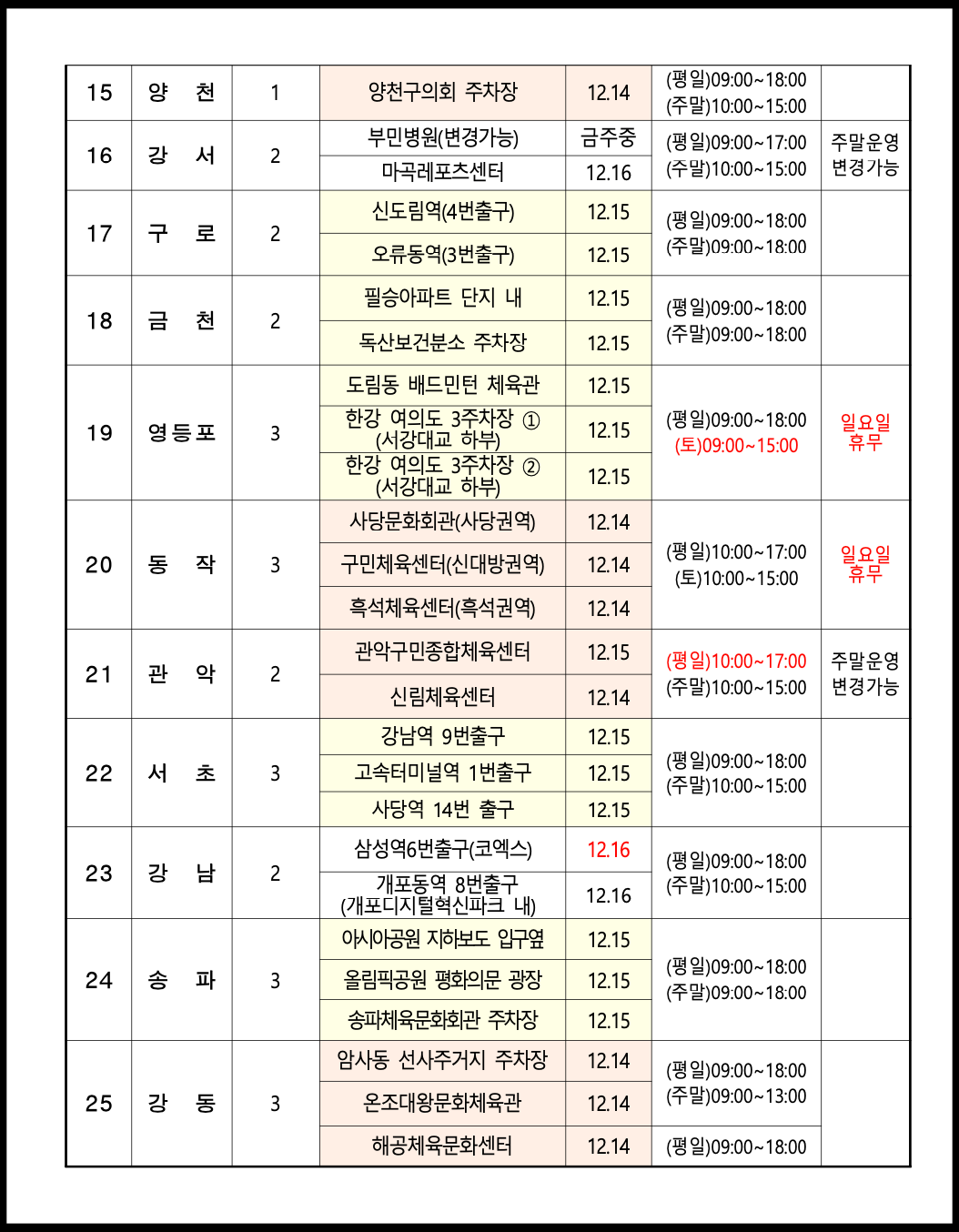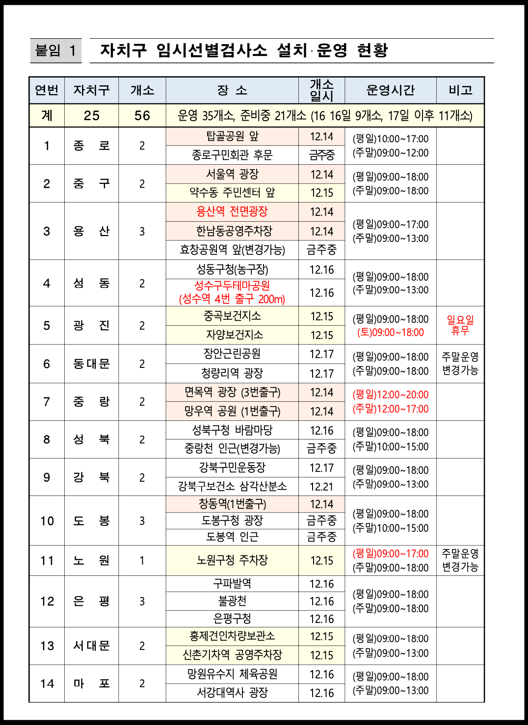 현재 서울시에서는 코로나19 임시 선별검사소 순차적으로 운영 중입니다. 25개 자치구 56개소 마련될 예정인데 14일 기준으로 14개소 열었다면 순차적으로 42개소 추가적으로 개소하여 총 56개소를 채우게 됩니다. 임시 선별검사소는 시민 누구나 무료로 익명검사할 수 있기 때문에 비용적인 부담이 없다고 보시면 됩니다. 역학적 연관성과도 관련 없습니다. 또한 임시 선별검사소는 운영시간 및 장소 등이 변경 될 여지가 있으므로 서울시 홈페이지 등을 반드시 참고하시기 바랍니다.