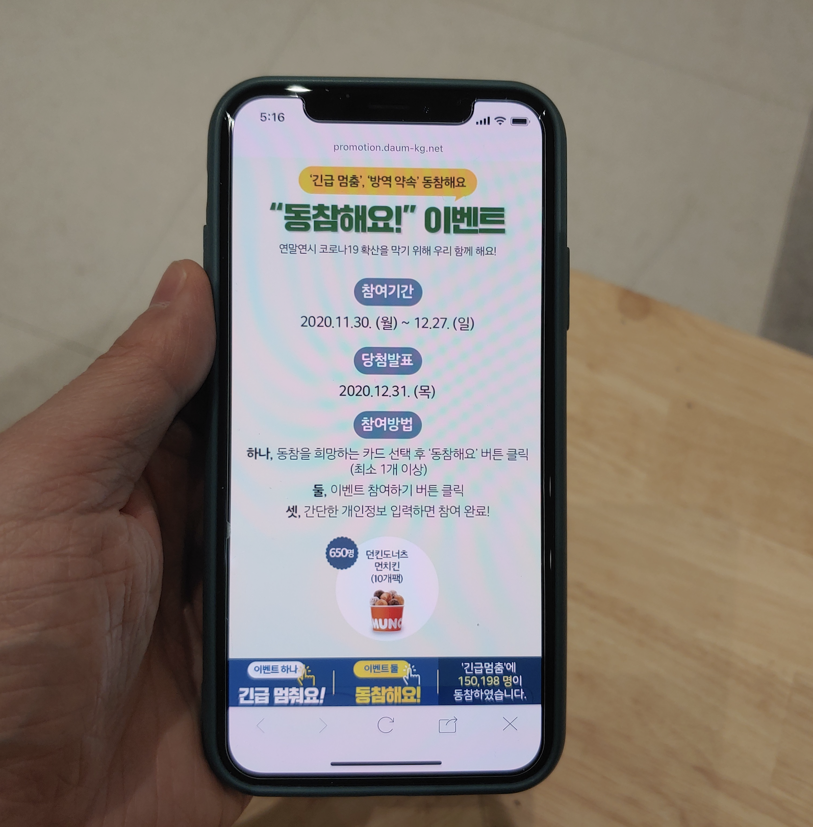 "동참해요" 이벤트는 지난 11월 30일 월요일부터 12월 27일 일요일까지 참여할 수 있으며 오는 12월 31일 당첨자 발표됩니다. 650명 대상으로 도너츠 경품 받을 수 있습니다. 동참 희망하는 카드 선택해서 이벤트 참여하시면 됩니다.