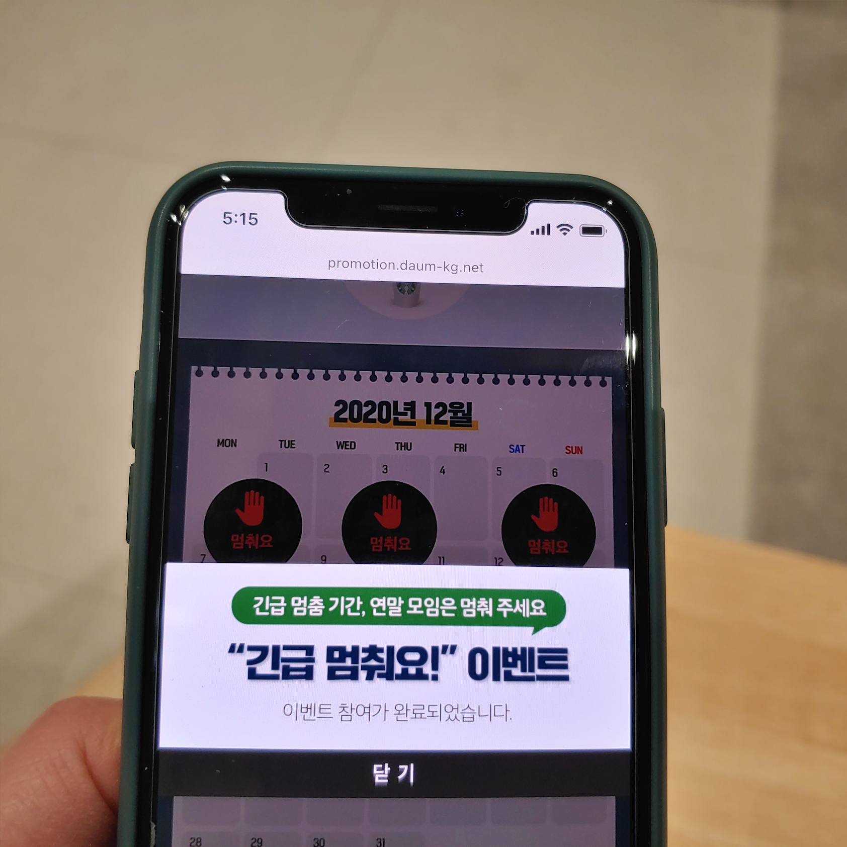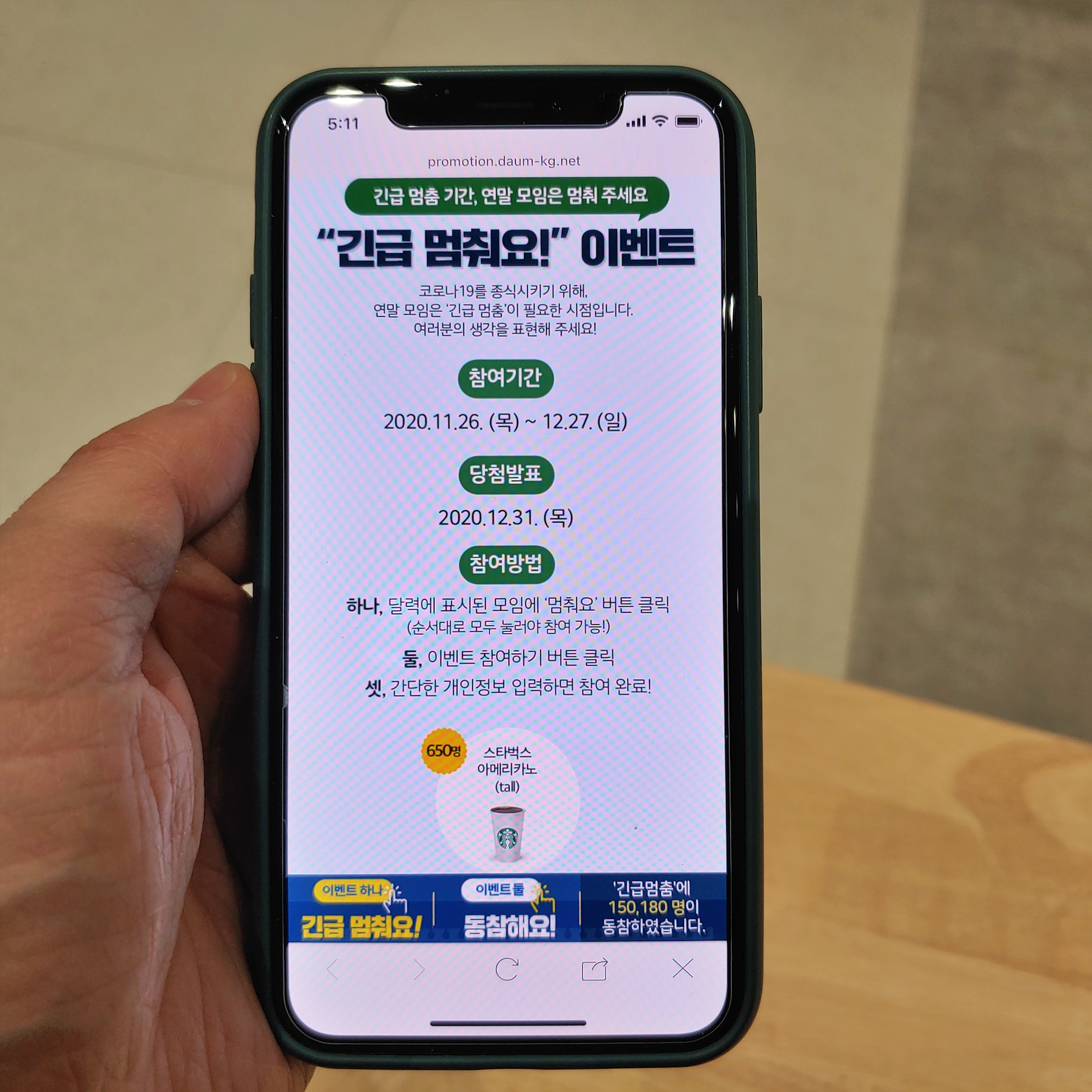 공익캠페인을 통해 긴급 멈춤에 대한 여러분의 생각을 표현하는 이벤트에 참여할 수 있습니다. "긴급 멈춰요!" 이벤트는 지난 11월 26일 목요일부터 12월 27일 일요일까지 참여할 수 있으며 오는 12월 31일 당첨자 발표됩니다. 당첨될 경우 커피 기프티콘 650명 대상으로 받을 수 있습니다. 달력에 표시된 모임에 '멈춰요' 버튼을 순서대로 누르면서 참여하면 됩니다.