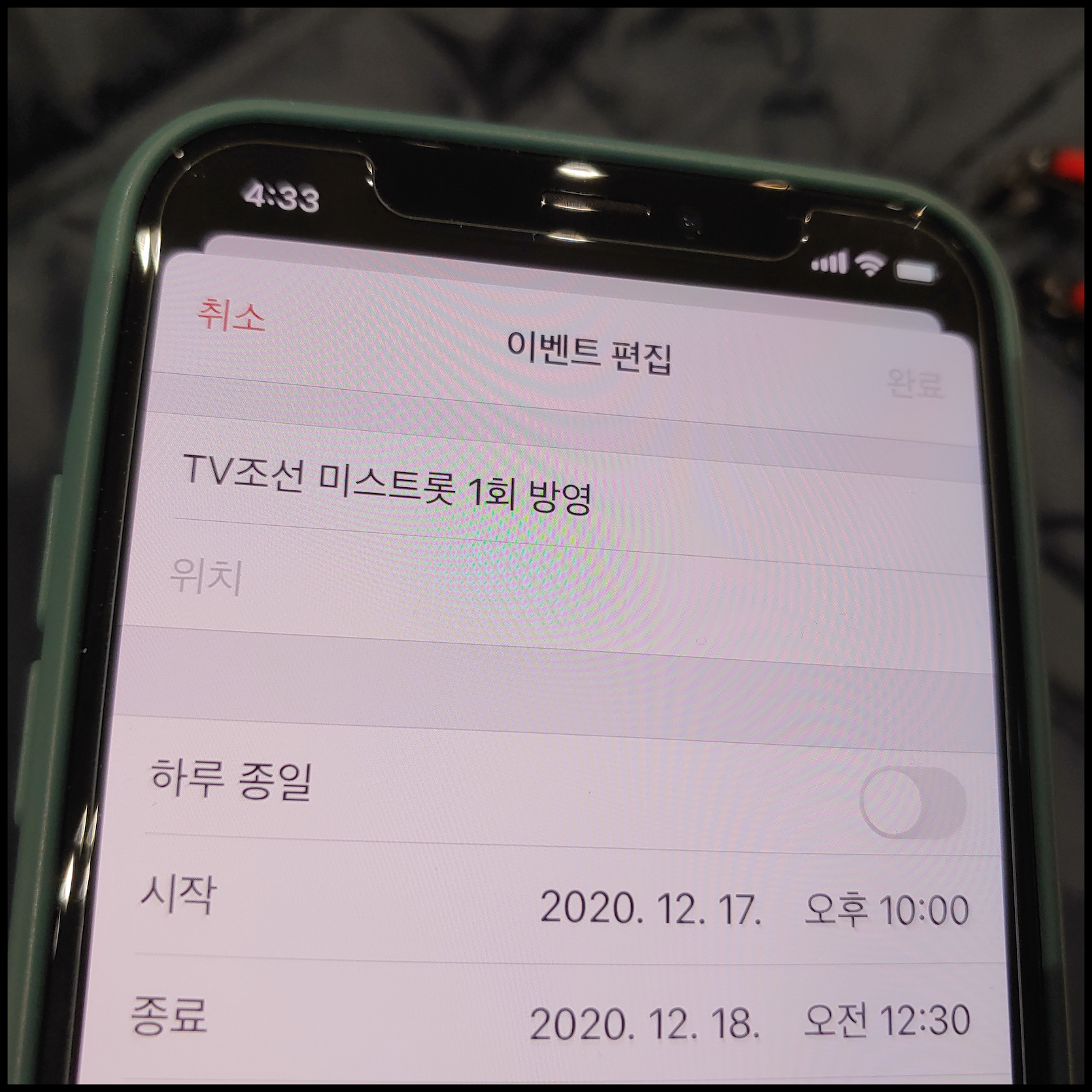 [사진 = 2020년 12월 17일 TV조선 미스트롯2 1회 방영됐습니다. 사진은 저의 스마트폰 달력이며 2020년 12월 17일을 가리킵니다. (C) 나이스블루]