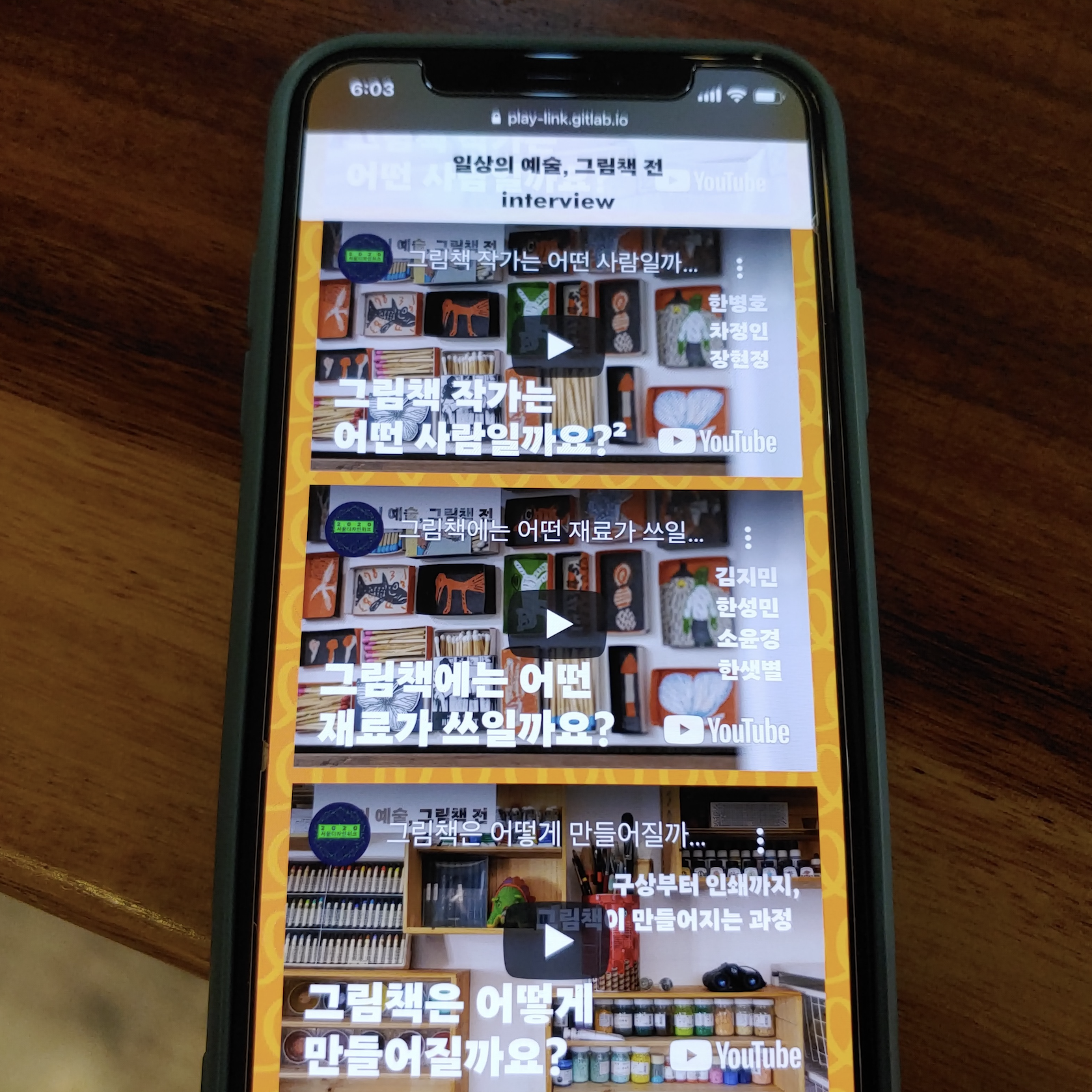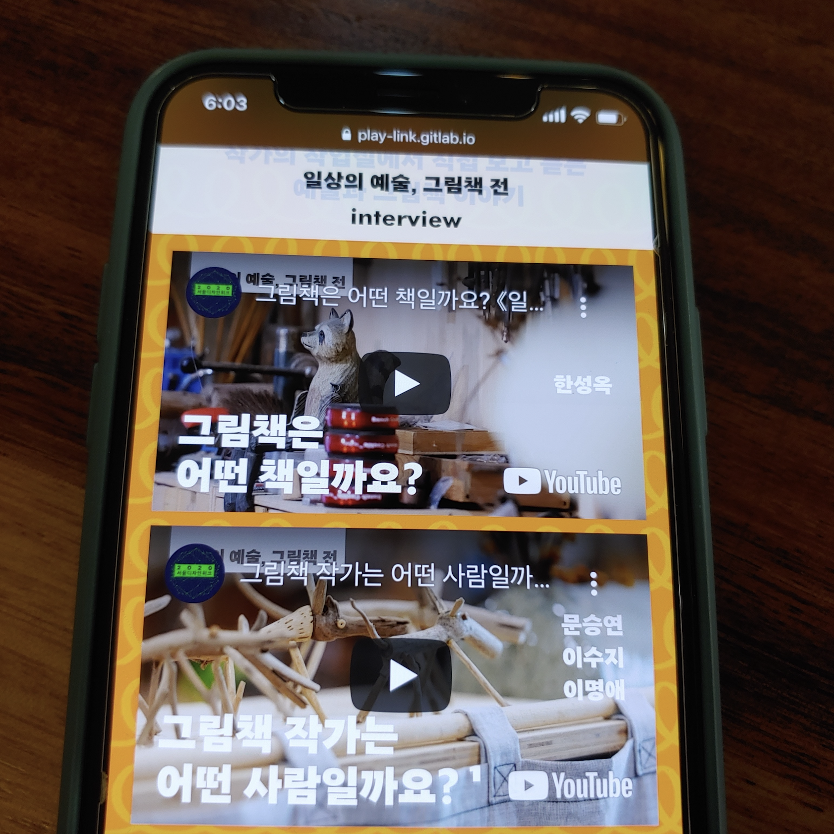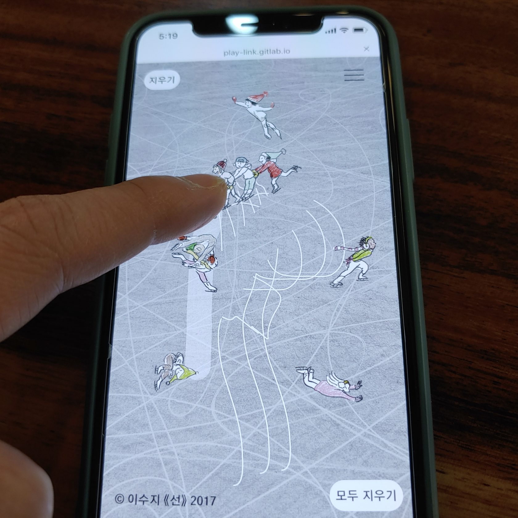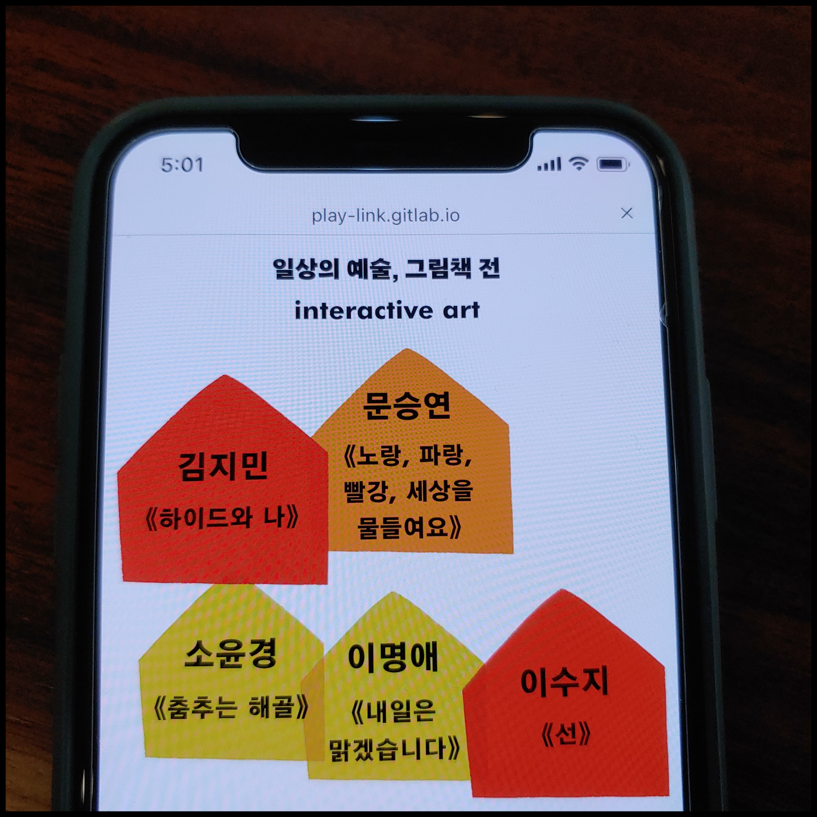 <선>이라는 작품 같은 경우 스케이트 타는 아이를 움직이면 스마트폰 화면에서 선의 굵기가 다르게 표현되는 모습을 볼 수 있습니다. 마치 ASMR을 듣는 것 같은 기분을 느낄 수 있습니다. 그러면서 인터랙티브 아트에 대하여 이해하게 됩니다. 인터랙티브(Interractive)가 상호작용을 뜻하는 것처럼 일상의 예술, 그림책 전에서 선보이는 콘텐츠는 작품과 누리꾼이 서로 교감을 하는 묘미가 있다는 것을 알 수 있습니다. 지금까지 오프라인에서 그림책을 읽을 때와는 전혀 다른 형태의 그림책을 접하게 됐습니다.