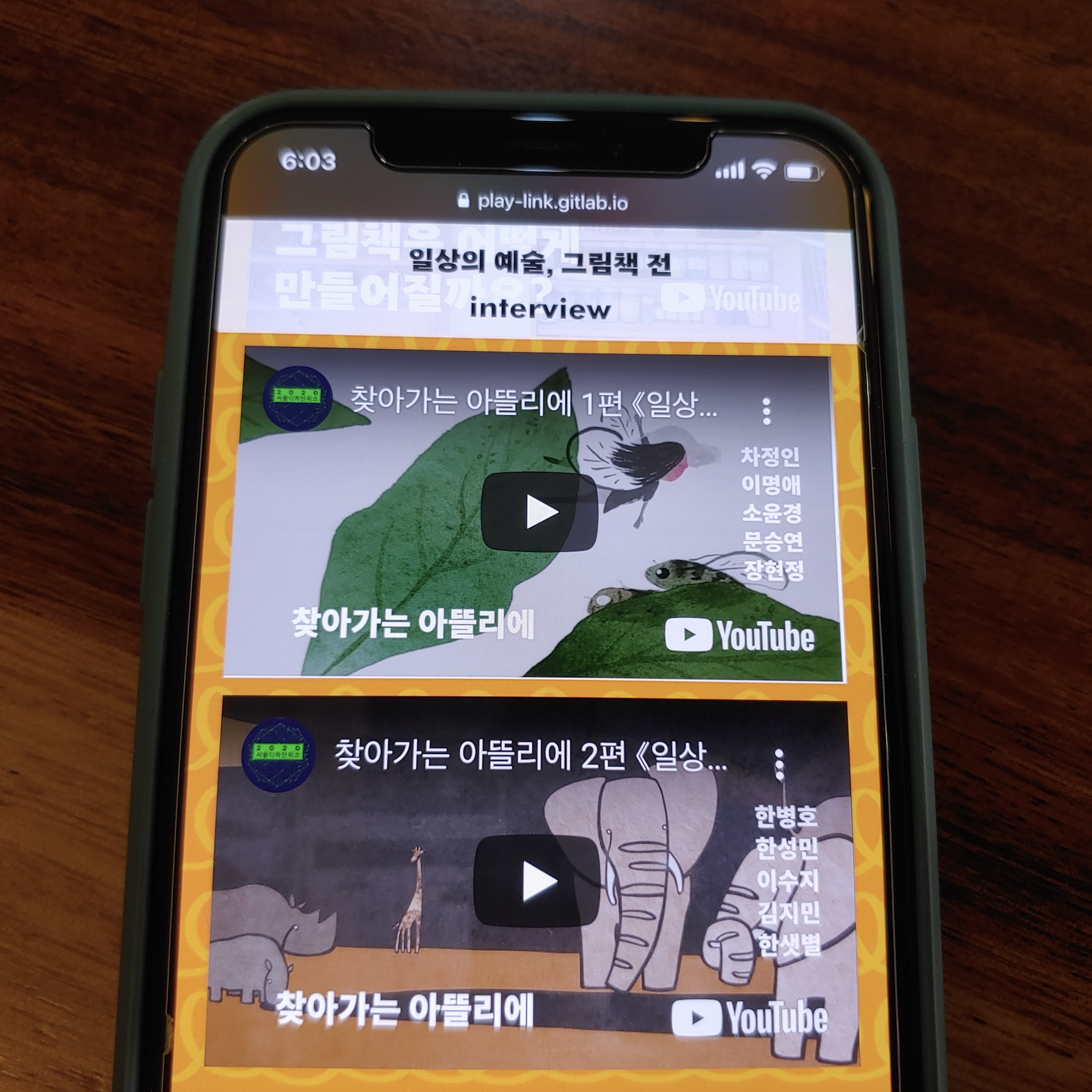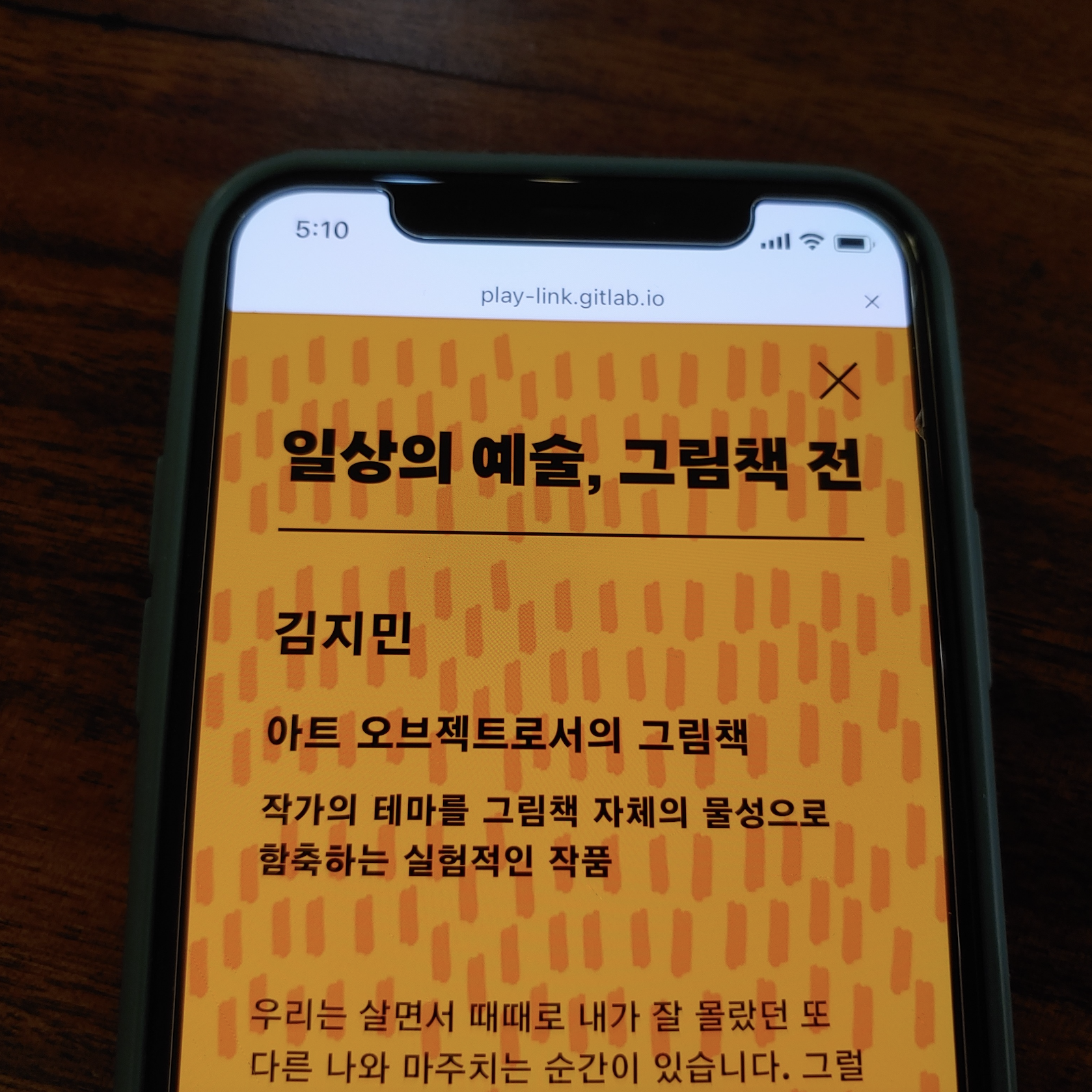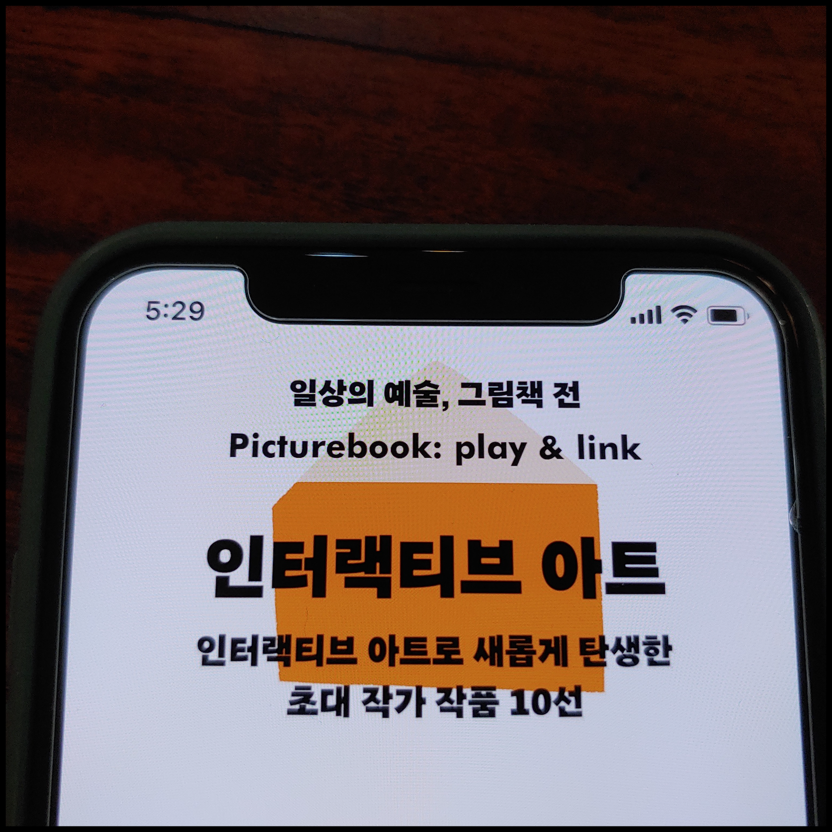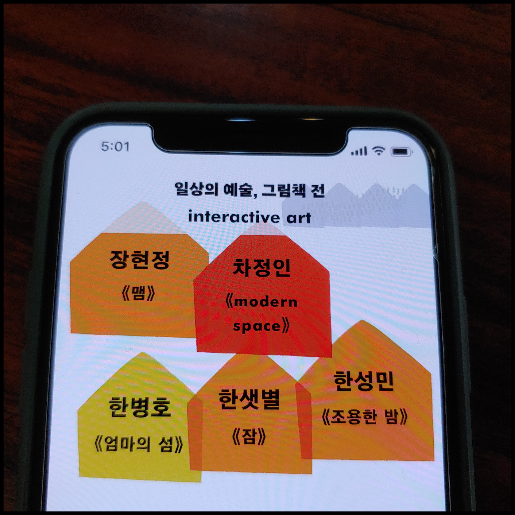 <선>이라는 작품 같은 경우 스케이트 타는 아이를 움직이면 스마트폰 화면에서 선의 굵기가 다르게 표현되는 모습을 볼 수 있습니다. 마치 ASMR을 듣는 것 같은 기분을 느낄 수 있습니다. 그러면서 인터랙티브 아트에 대하여 이해하게 됩니다. 인터랙티브(Interractive)가 상호작용을 뜻하는 것처럼 일상의 예술, 그림책 전에서 선보이는 콘텐츠는 작품과 누리꾼이 서로 교감을 하는 묘미가 있다는 것을 알 수 있습니다. 지금까지 오프라인에서 그림책을 읽을 때와는 전혀 다른 형태의 그림책을 접하게 됐습니다.