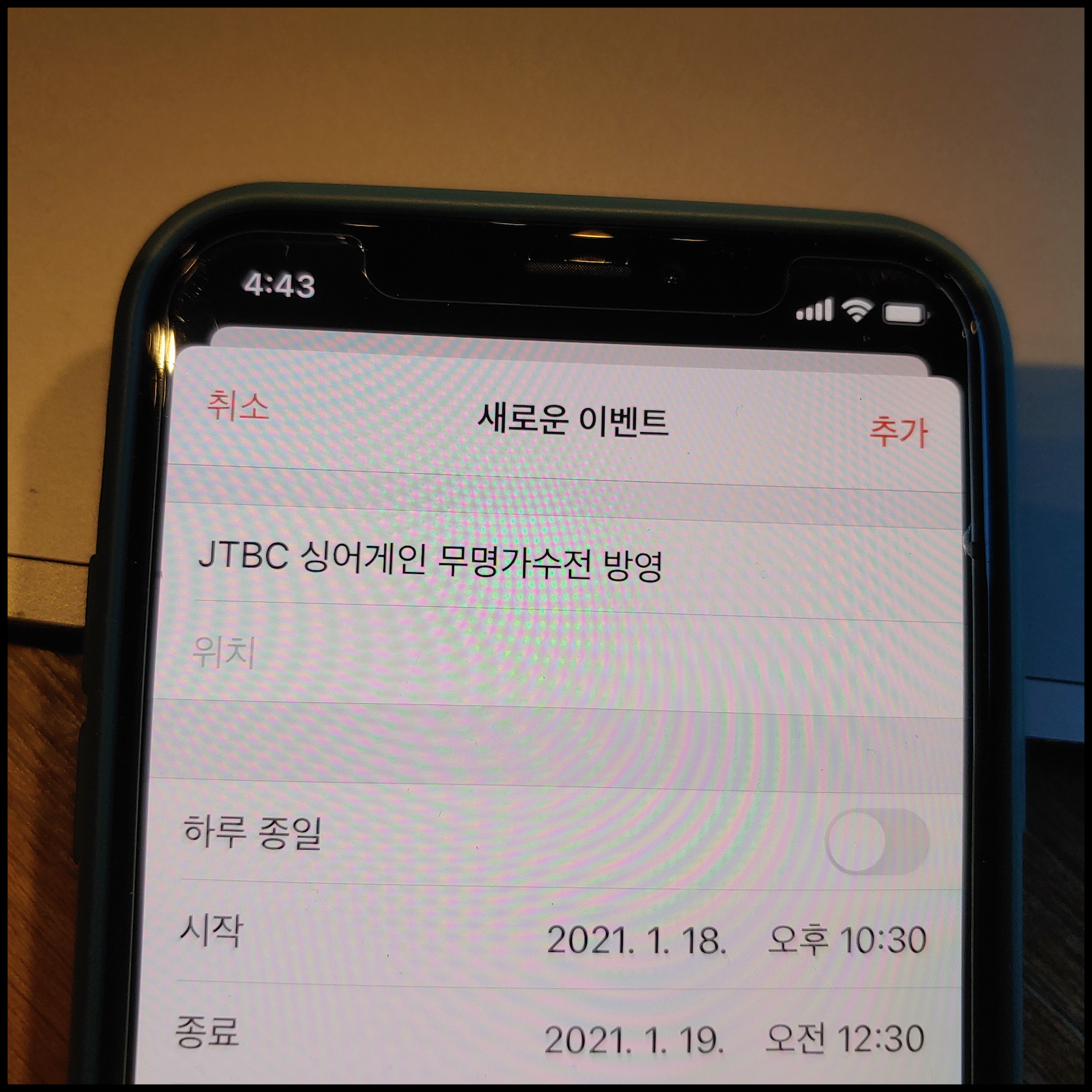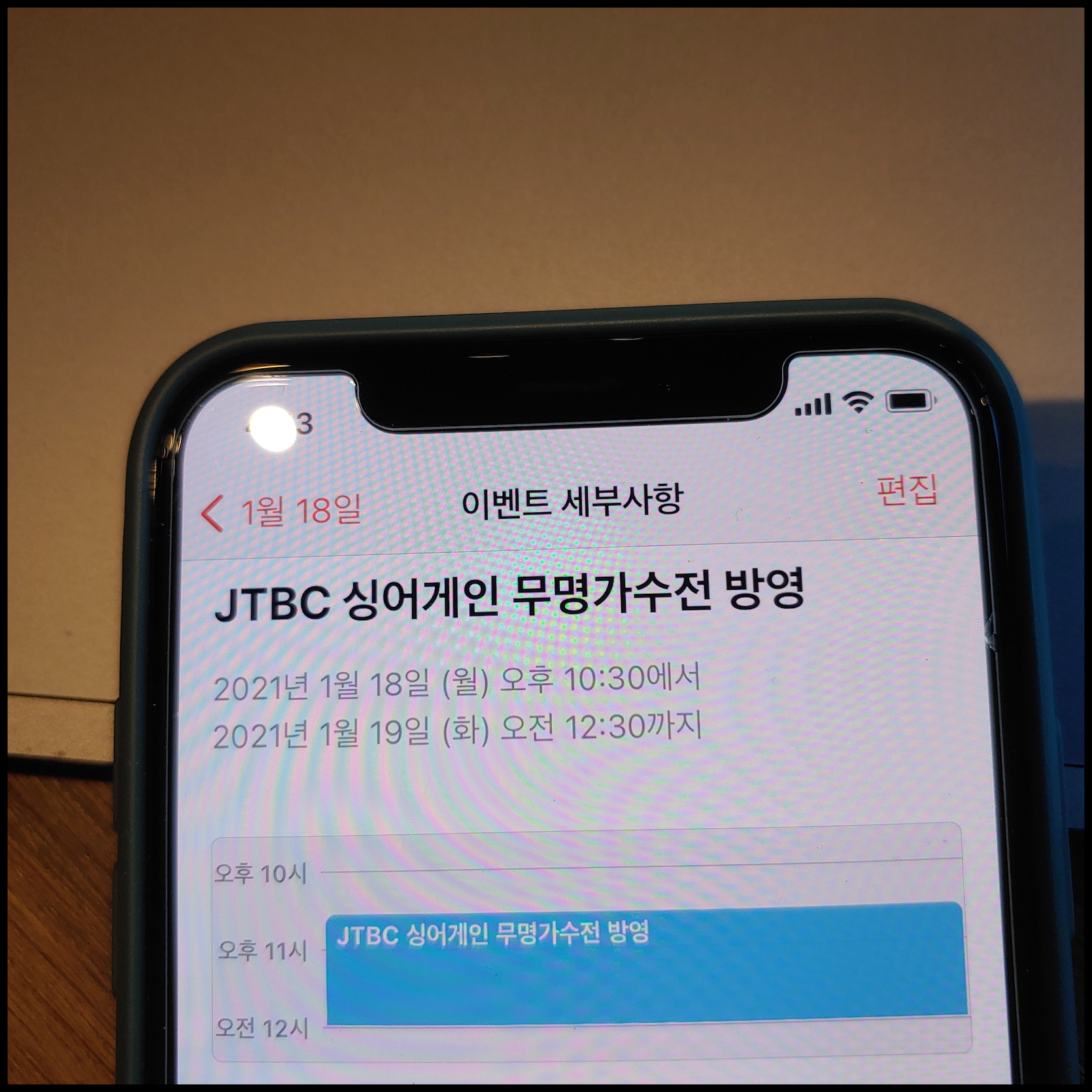 [사진 = 2021년 1월 18일 JTBC 싱어게인 - 무명가수전 방영 됩니다. 사진은 저의 스마트폰 달력이며 2021년 1월 18일을 가리킵니다. (C) 나이스블루]