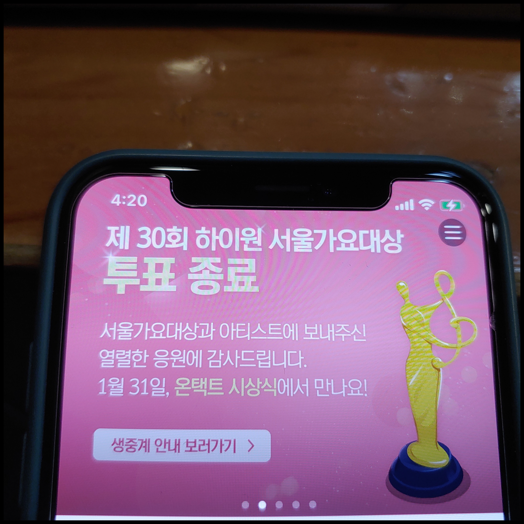 [사진 = 서울가요대상 공식 앱에서는 제30회 하이원 서울가요대상 투표 종료되었음을 알렸습니다. 그동안 자신이 응원하는 아티스트의 수상을 위해 열성적으로 투표했던 분들이 많으셨을 겁니다. 이제 1월 31일 일요일 오후 6시 50분부터 진행되는 2021 서울가요대상(제30회 하이원 서울가요대상) 통해서 수상자가 결정될 예정입니다. 아울러 2021 서울가요대상 중계 케이블채널 및 앱에서 볼 수 있습니다. 케이블채널은 KBSdrama, KBSjoy, KBSw 입니다. 그와 더불어 U+아이돌Live 앱에서 중계 볼 수 있습니다. 해외에 계신 분은 니코니코생방송 통해서 볼 수 있다고 합니다. (C) 제30회 하이원 서울가요대상 공식투표 앱]