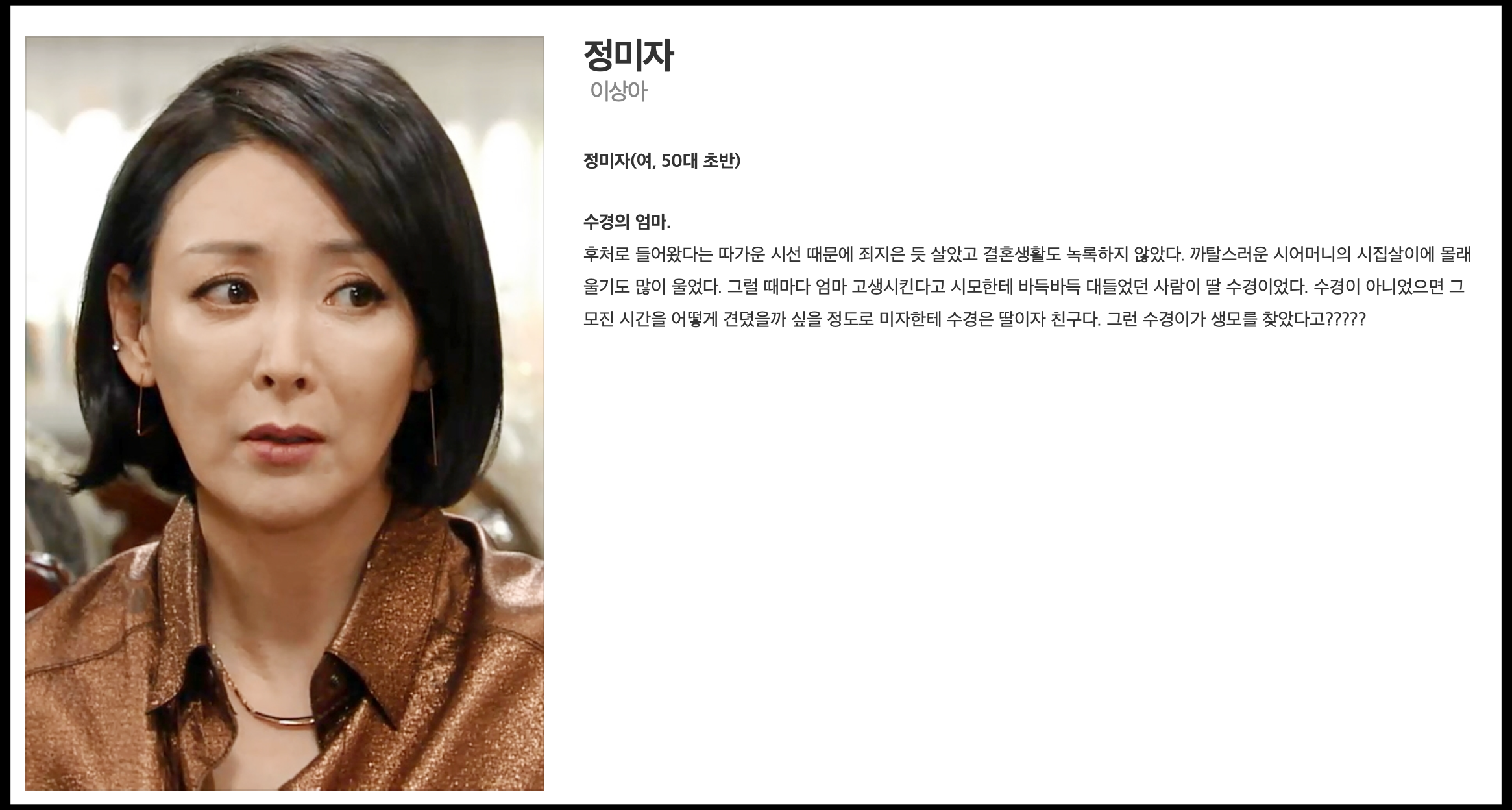 [사진 = 이상아는 2016년 SBS 드라마 내 사위의 여자에서 정미자 역으로 출연했습니다. 이 드라마는 최고 시청률 13.5%(닐슨코리아 기준) 기록했던 120부작이며 서하준, 양진성 등이 등장했습니다. 5년 뒤 이상아는 SBS의 다른 프로그램에 출연하게 됐습니다. 화요일 예능 프로그램 불타는 청춘입니다. 불타는 청춘이 2015년 런칭했던 예능이라는 점에서 오랫동안 꾸준한 사랑 받고 있음을 알 수 있습니다. (C) SBS 내 사위의 여자 공식 홈페이지 등장인물]