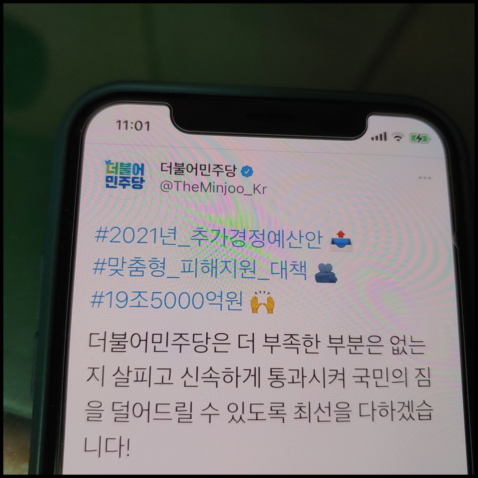 [사진 = 더불어민주당에서는 공식 트위터를 통해 2021년 추가경정예산안 관련 게시물을 올리면서 맞춤형 피해지원 대책으로 19.5조원(690만 명) 마련되었음을 알렸습니다. 그 중에 소상공인 버팀목자금 6.7조 원, 여행 및 공연 등 경영위기 업종 200만 원 지원, 한계 근로 빈곤층 80만 가구 지원, 생계 위기 대학생 1만 명 250만 원(5개월), 소상공인 전기요금 감면 소식을 전했습니다. (C) 더불어민주당 공식 트위터]