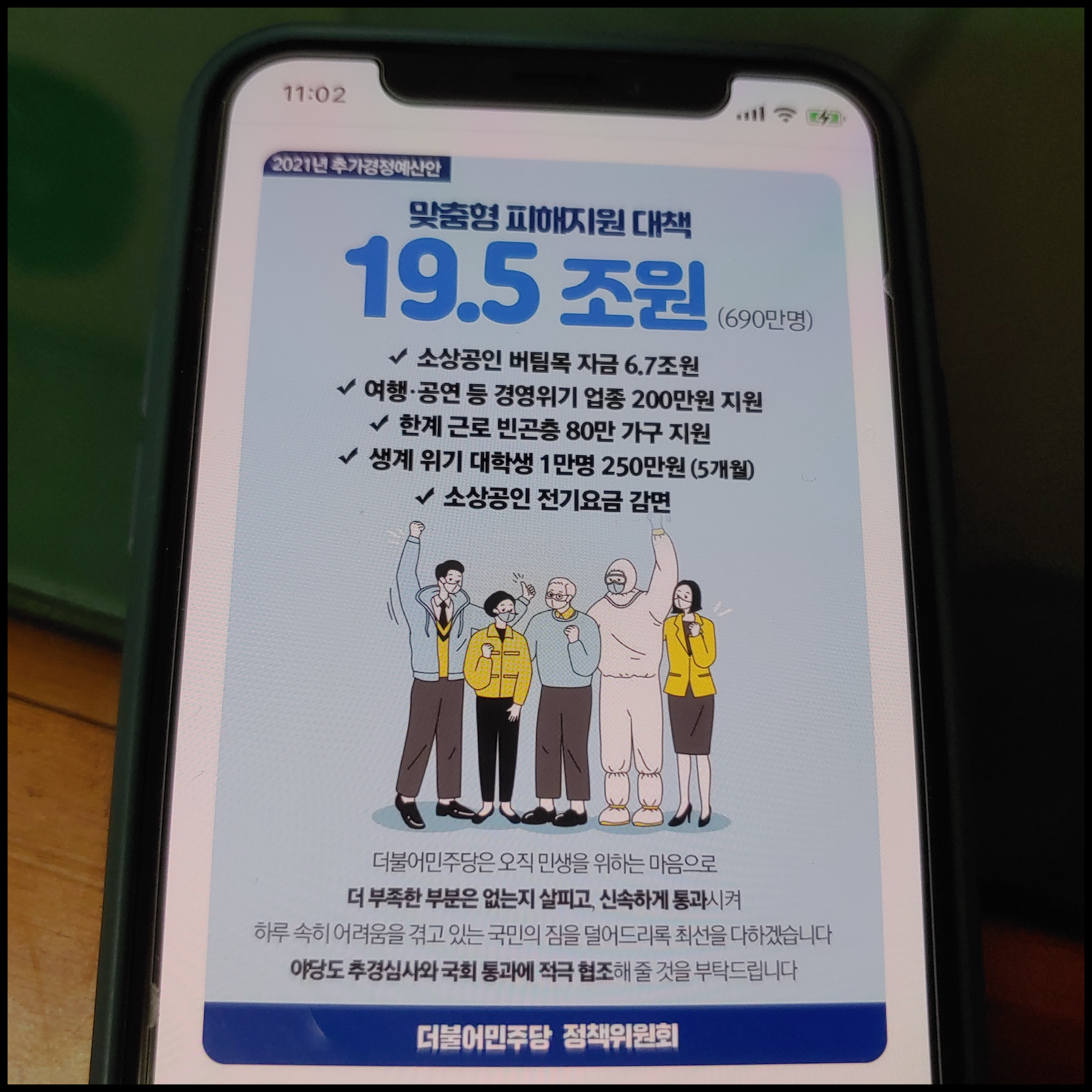 [사진 = 더불어민주당에서는 공식 트위터를 통해 2021년 추가경정예산안 관련 게시물을 올리면서 맞춤형 피해지원 대책으로 19.5조원(690만 명) 마련되었음을 알렸습니다. 그 중에 소상공인 버팀목자금 6.7조 원, 여행 및 공연 등 경영위기 업종 200만 원 지원, 한계 근로 빈곤층 80만 가구 지원, 생계 위기 대학생 1만 명 250만 원(5개월), 소상공인 전기요금 감면 소식을 전했습니다. (C) 더불어민주당 공식 트위터]
