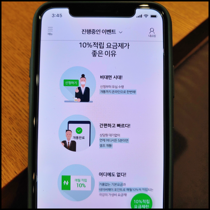 네이버페이 혜택을 살펴보면서 저의 시선에 눈길을 끌었던 것이 있습니다. 10% 적립 요금제였습니다. 적립률 큰 요금제인데 통신비 및 생활비 절약에 도움된다는 것을 알게 됐습니다. 기본료 10%를 네이버페이 포인트로 적립 가능한 요금제이기 때문입니다. 알뜰폰 요금제 사용만으로 통신비를 아낄 수 있는데 매월 네이버페이 포인트로 10% 적립까지 가능해서 네이버 쇼핑등을 하는데 도움 될 수 있습니다. 그 요금제가 바로?
