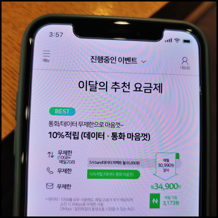 눈여겨 볼 알뜰폰 요금제가 있다면 '10% 적립(데이터·통화 마음껏)'이 아닐까 싶습니다. 데이터는 무제한(10GB + 매일 2GB 제공, 소진 시 3Mbps 속도로 무제한) 제공됩니다. 3Mbps 같은 경우 일반 화질 동영상 시청 가능한 속도입니다. 통화 및 문자는 무제한 제공됩니다. 월 34,900원에 쓸 수 있으며 여기에 10% 해당되는 3,173원이 네이버페이 포인트로 적립됩니다.